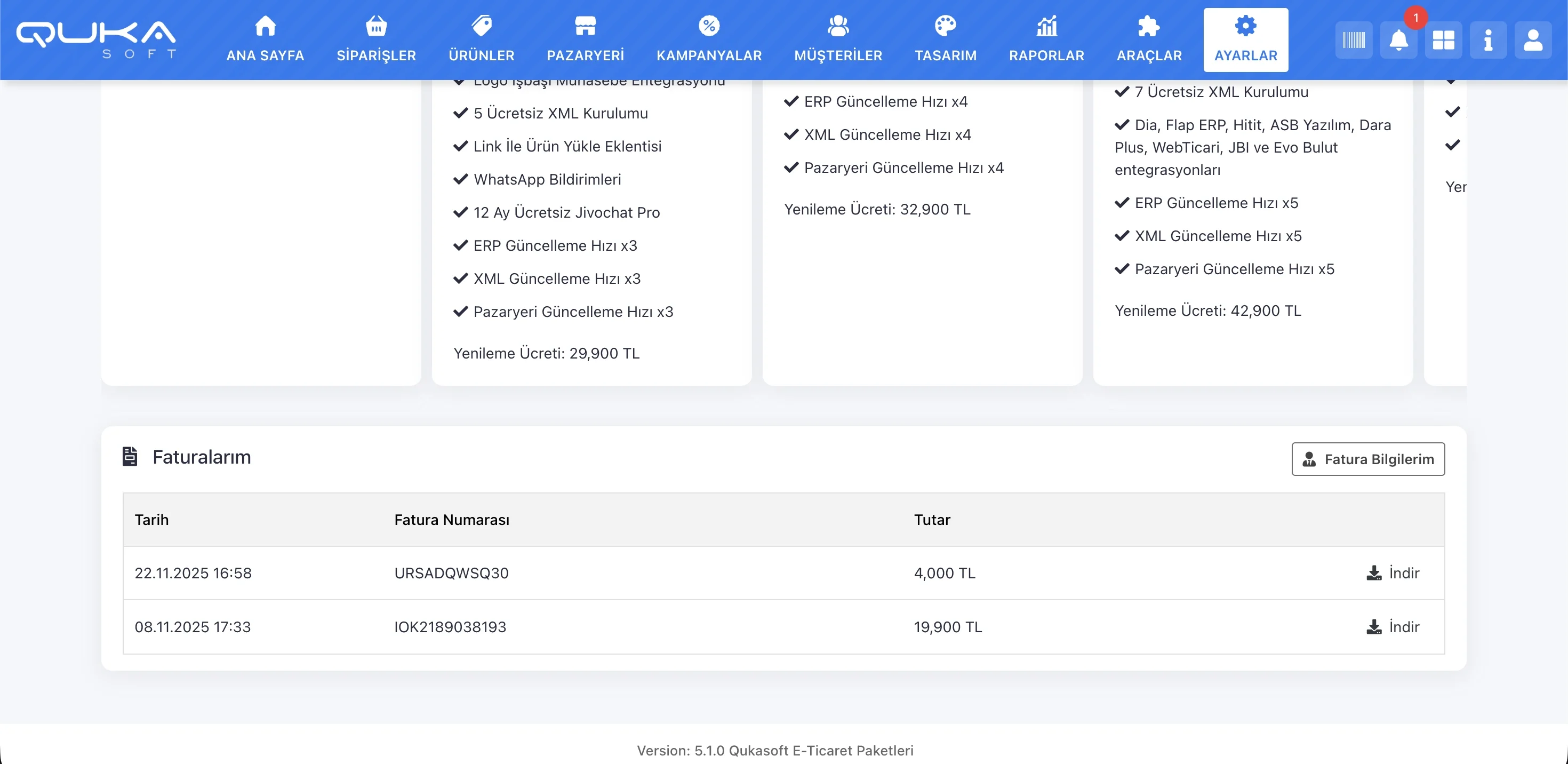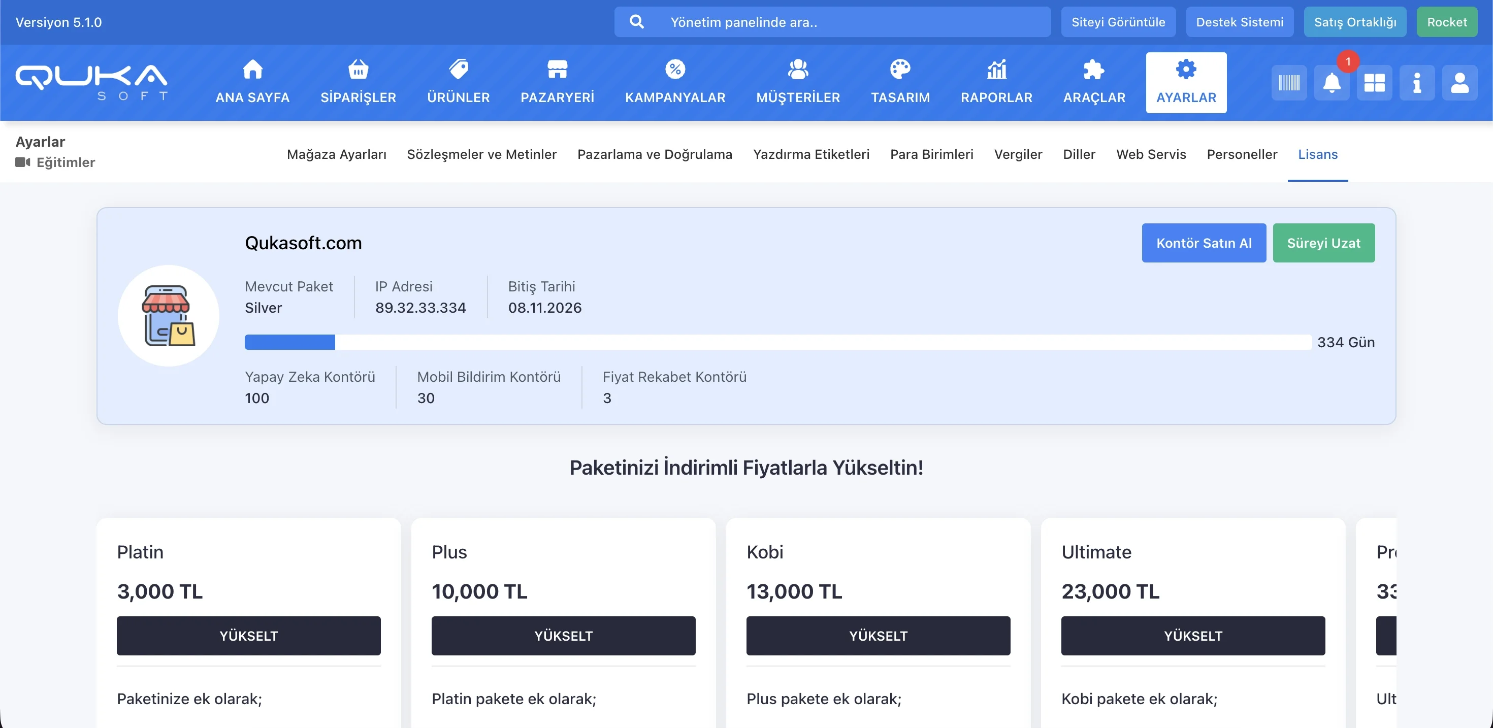Ayarlar > Lisans sayfasından e-ticaret paketinizin lisans bilgilerini görüntüleyebilir, kontör satın alabilir ve paket süresini uzatabilirsiniz.