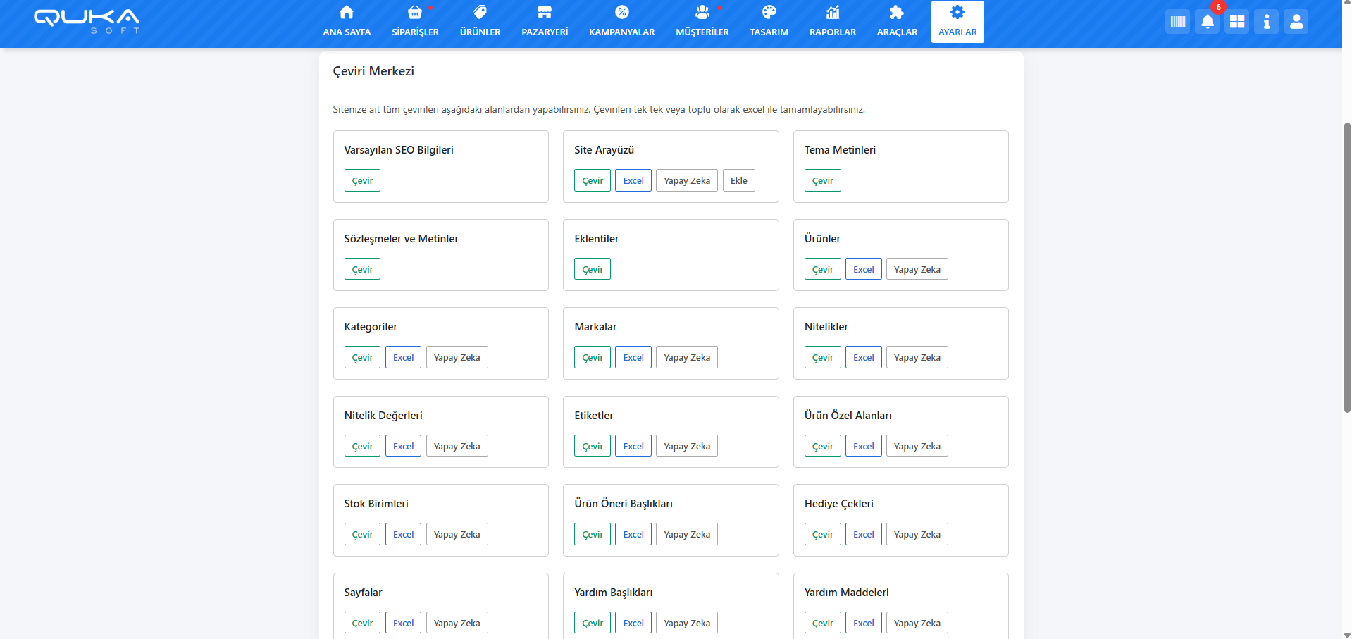 | SEO Bilgileri | Ürün, kategori, marka gibi alanların başlık ve açıklamaları |