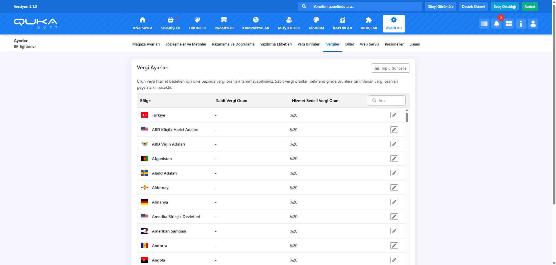Vergiler alanı, yönetim paneli üzerinden ürün ve hizmet bedellerine ait vergi oranlarının ülke bazında tanımlanmasını sağlar. Bu alan sayesinde sabit vergi oranları, hizmet bedeli vergileri ve ürün bazlı vergi özelleştirmeleri yönetilebilir.