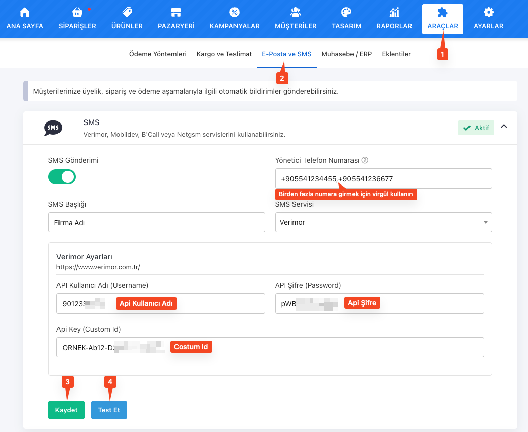 - API bilgilerinizin doğruluğunu test etmek için test edebileceğiniz buton yer almaktadır. Test Et butonuna tıklayarak kontrollerinizi sağlayabilirsiniz. (4)