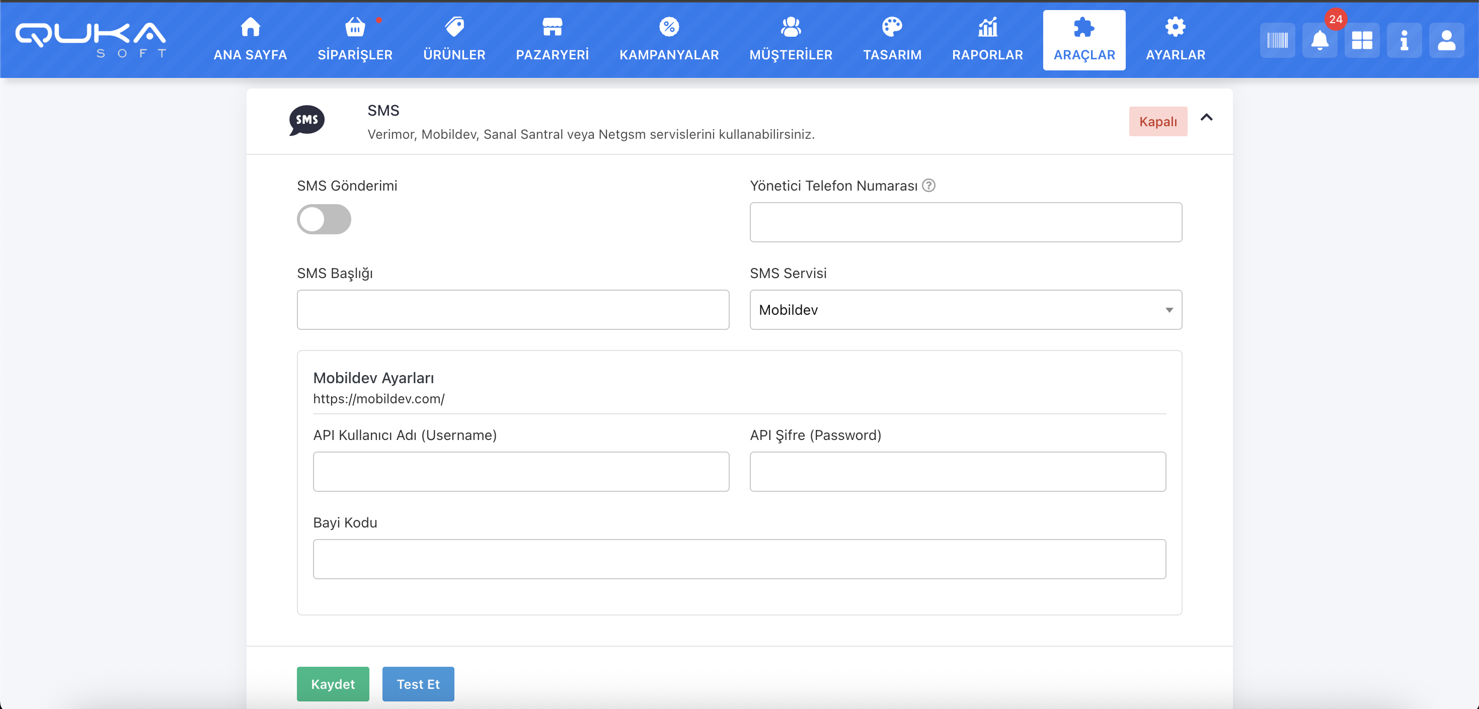 Mobildev, e-ticaret süreçlerinde sipariş durumu, kampanya ve ödeme hatırlatmaları gibi bildirimlerin otomatik SMS olarak gönderilmesini sağlayan bir servis sağlayıcıdır. Bu hizmetin aktif edilmesi için Qukasoft yönetim paneli Araçlar > E-Posta / SMS menüsü kullanılır.