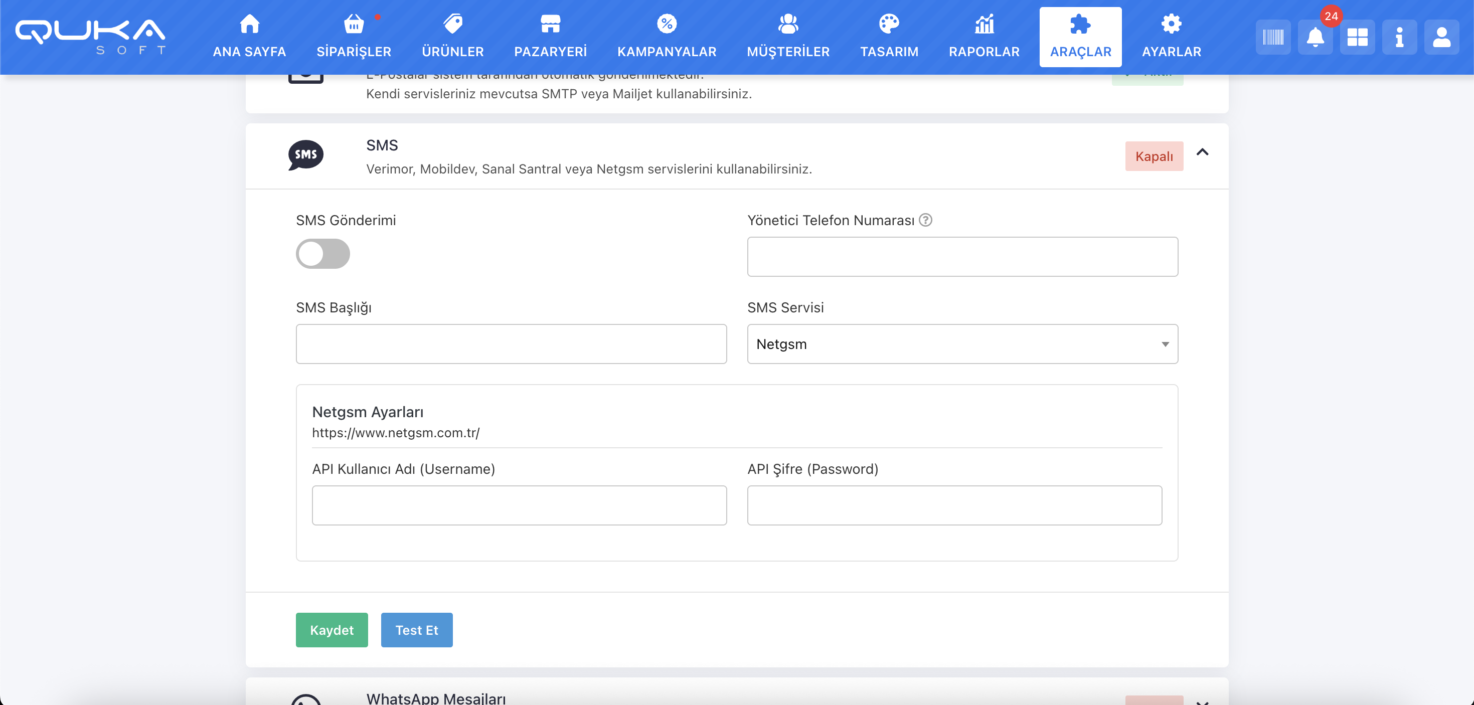 NetGSM, Türkiye genelinde SMS, sesli mesaj ve sanal santral hizmetleri sunan bir servis sağlayıcıdır. Qukasoft yönetim paneli üzerinden gerçekleştirilen NetGSM entegrasyonu ile müşterilere otomatik bildirimler ve sistem mesajları iletilebilir. İlgili ayarlara Araçlar > E-Posta ve SMS sayfasından erişilir.