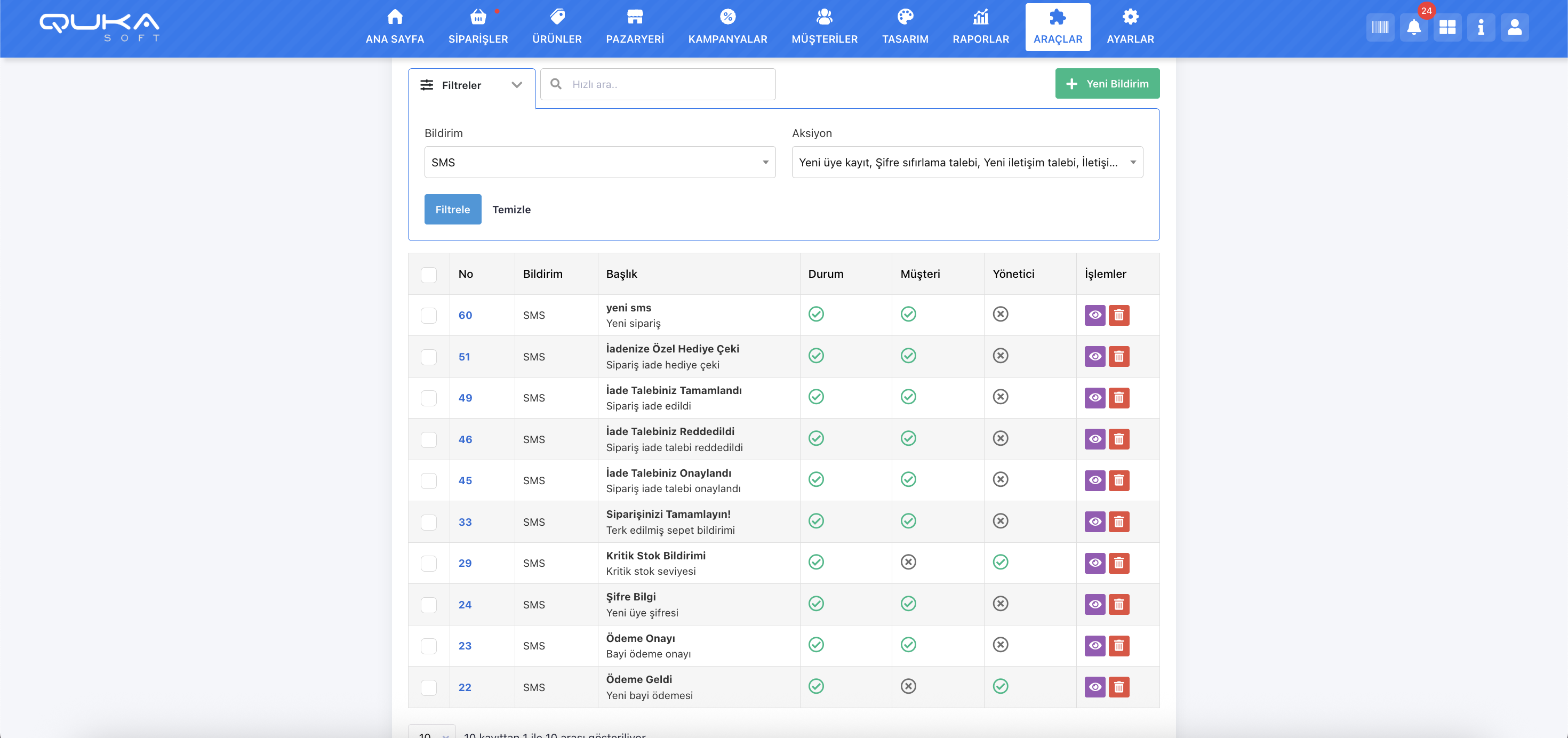 Qukasoft yönetim paneli Araçlar > E-Posta ve SMS sayfası üzerinden, sistem içerisinde gerçekleşen çeşitli aksiyonlar için otomatik SMS bildirimleri yapılandırılır. Bu alanda müşteri ve yöneticiye hangi durumlarda mesaj iletileceği ve mesajın içeriği özelleştirilebilir.