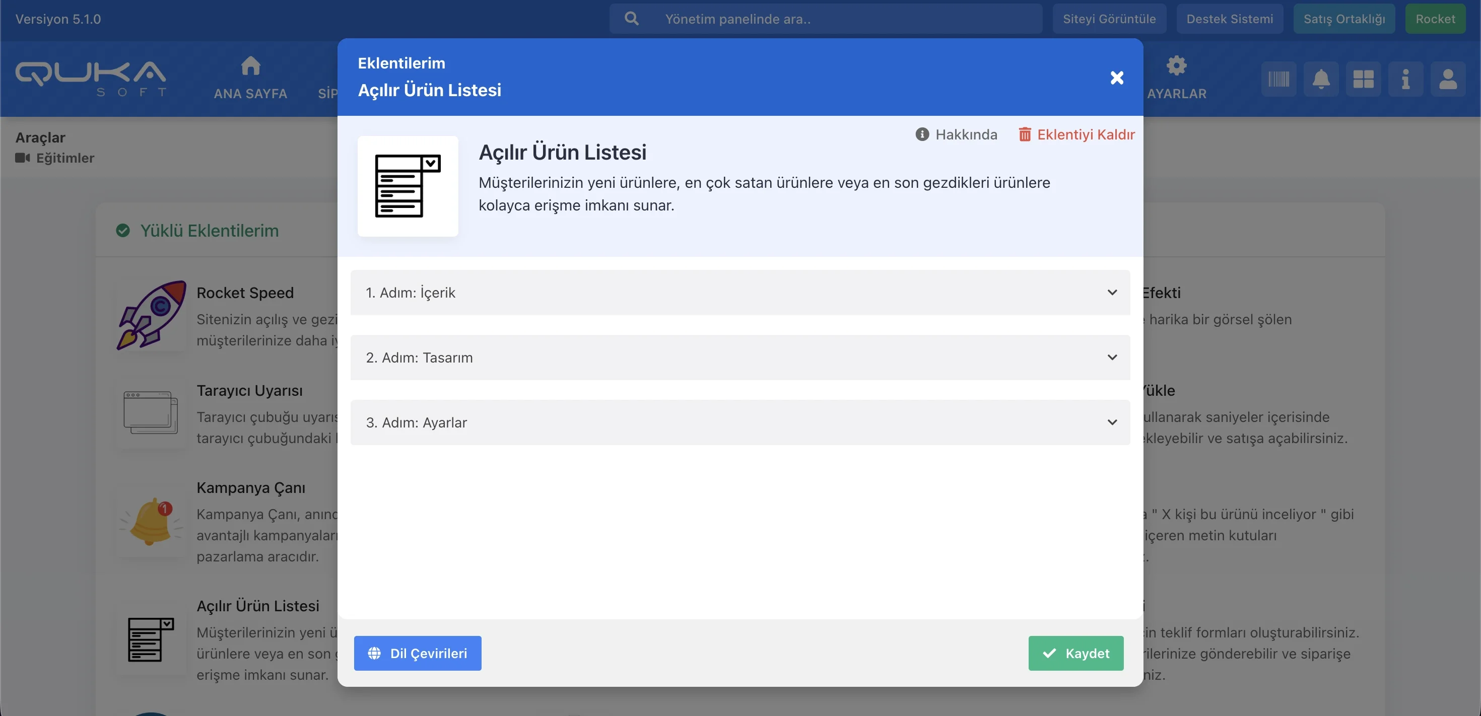 Açılır ürün listesi eklentisi, ziyaretçilerinizin ilgi duyabileceği ürün gruplarını dinamik bir panelde sunarak site içi navigasyonu kolaylaştıran ve satış dönüşümlerini artıran bir araçtır. Qukasoft yönetim paneli üzerinden yapılandırılan bu modül; yeni gelen ürünleri, en çok satanları veya müşterinin daha önce incelediği ürünleri hatırlatarak alışveriş deneyimini kişiselleştirir.