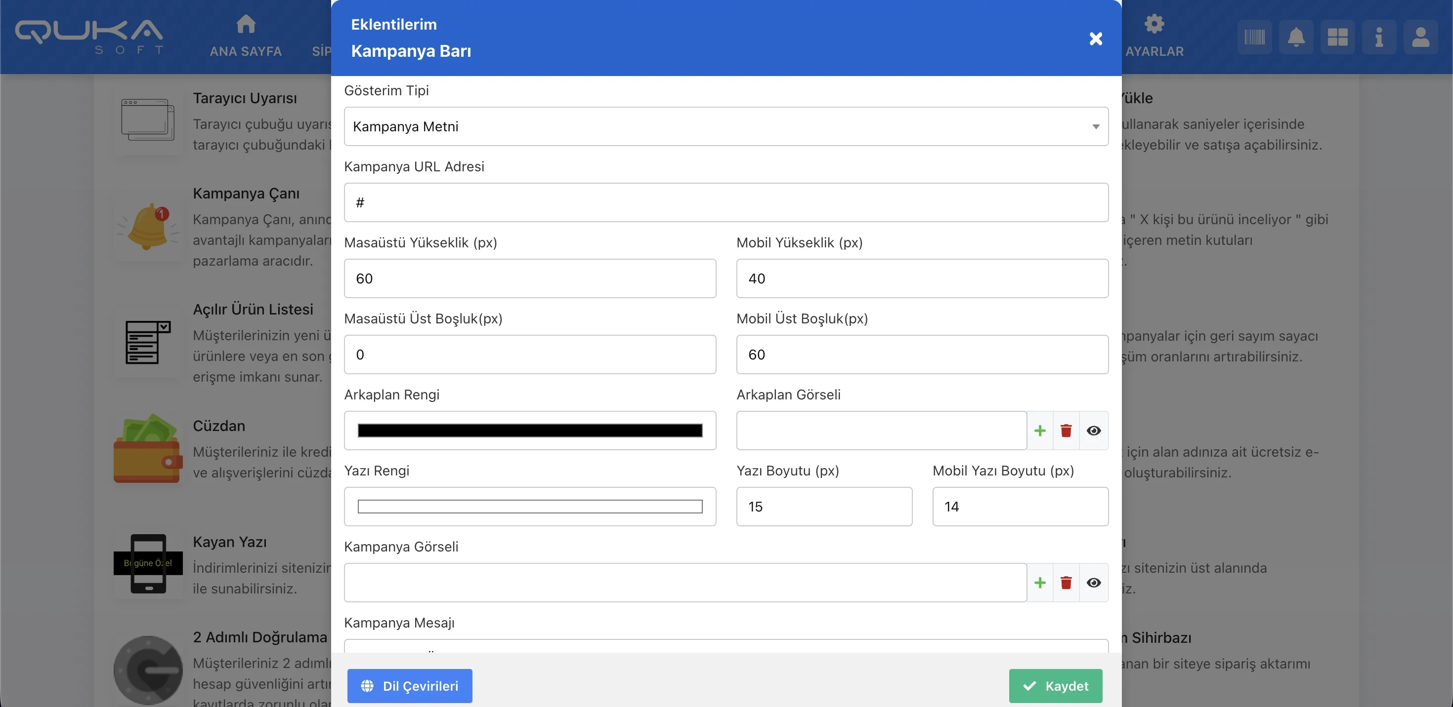 | Görsel Boyutlandırma | Bar içine eklenen kampanya görselinin genişlik ve yükseklik değerlerini manuel belirleme. |