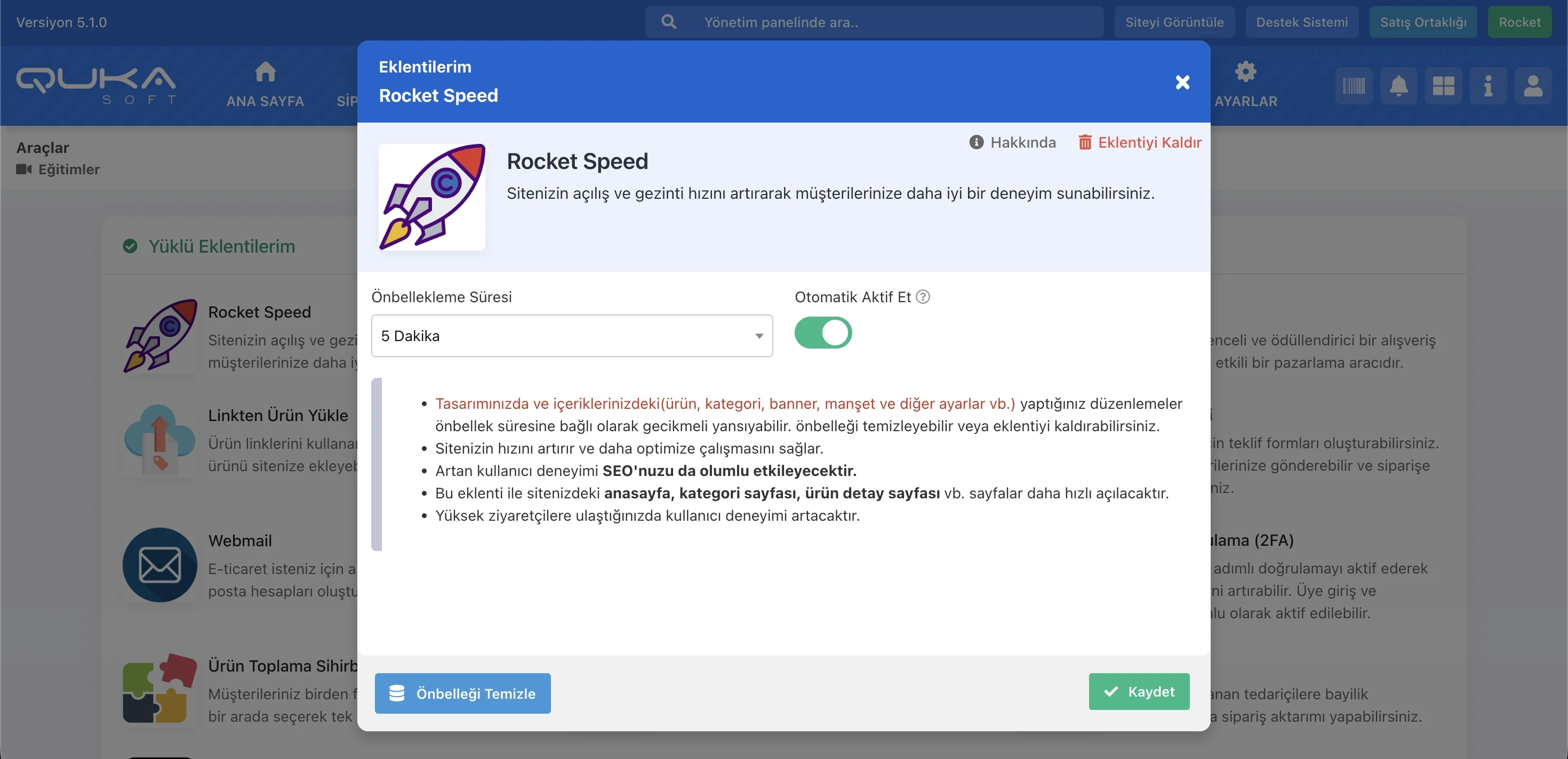 Rocket Speed modülü, web sitenizin yüklenme hızını optimize eden ve tarayıcı önbellekleme (cache) mekanizmasını kullanarak ziyaretçilere çok daha hızlı bir gezinti deneyimi sunan bir performans aracıdır. Qukasoft yönetim paneli üzerinden aktif edilen bu eklenti, sayfaların sunucu yerine önbellekten yüklenmesini sağlayarak sunucu yükünü azaltır ve SEO performansını doğrudan artırır.