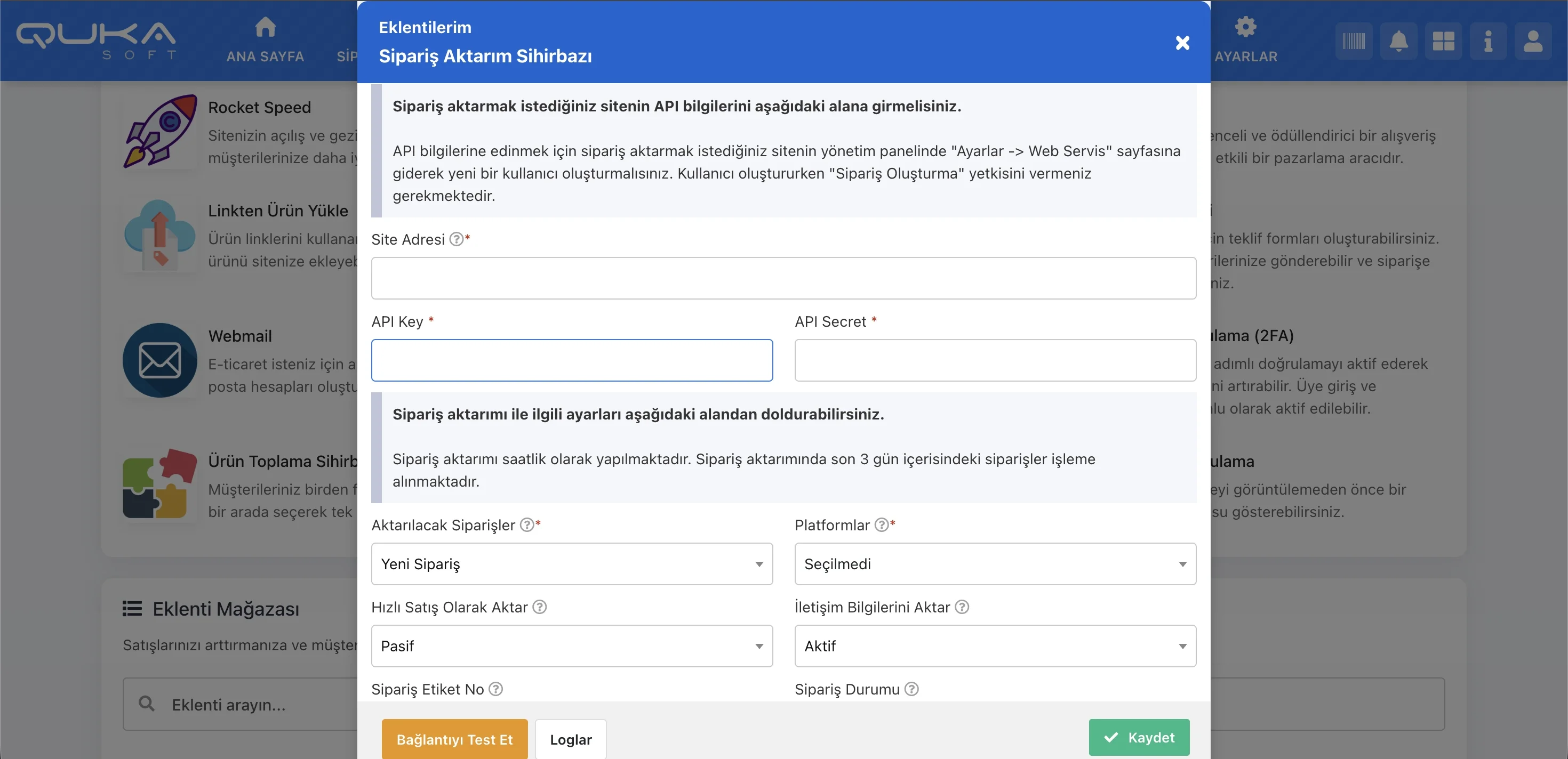 Sipariş aktarım sihirbazı, Qukasoft altyapısını kullanan farklı web sitelerinizdeki siparişleri tek bir merkezde toplamanıza olanak tanır. Bu modül sayesinde birden fazla mağazanın sipariş yönetimi otomatikleştirilerek operasyonel verimlilik sağlanır.
