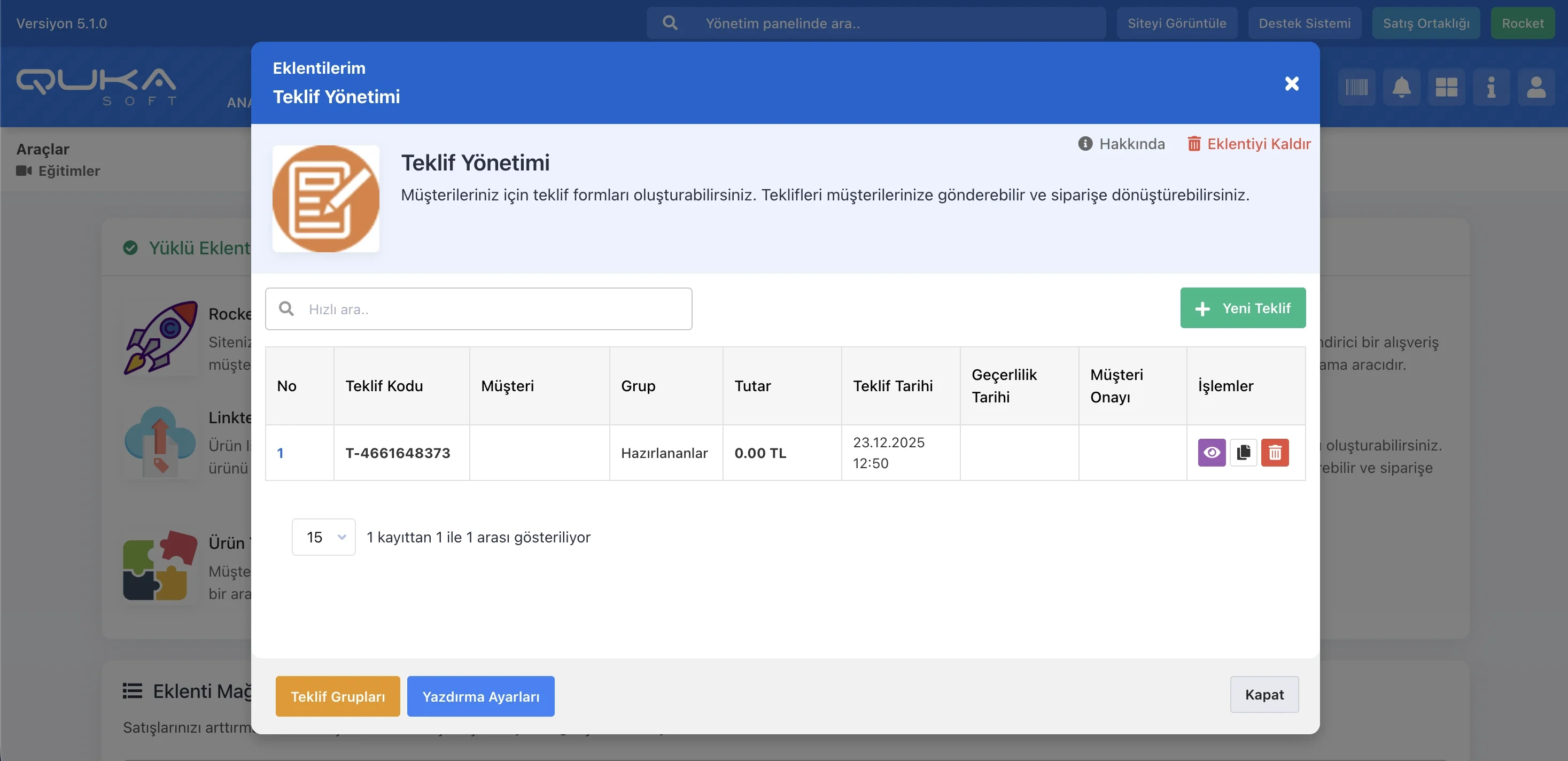 - Teklif Grupları: Hazırlanan tekliflerin kategorize edilmesi ve toplu takibi bu alandan gerçekleştirilir.