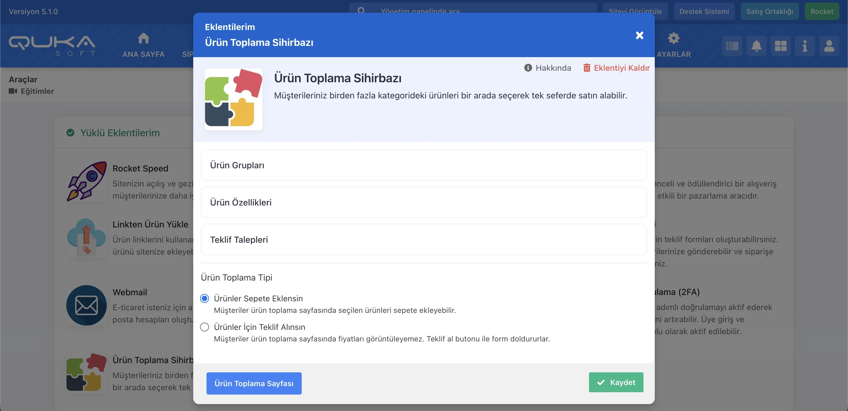 Ürün toplama sihirbazı, müşterilerinizin farklı kategorilerdeki uyumlu ürünleri bir araya getirerek kendi setlerini oluşturmalarına ve tek seferde satın almalarına olanak tanıyan etkileşimli bir modüldür. Qukasoft yönetim paneli üzerinden yapılandırılan bu sistem, özellikle karmaşık sistemlerin veya özelleştirilebilir setlerin satışını kolaylaştırır.