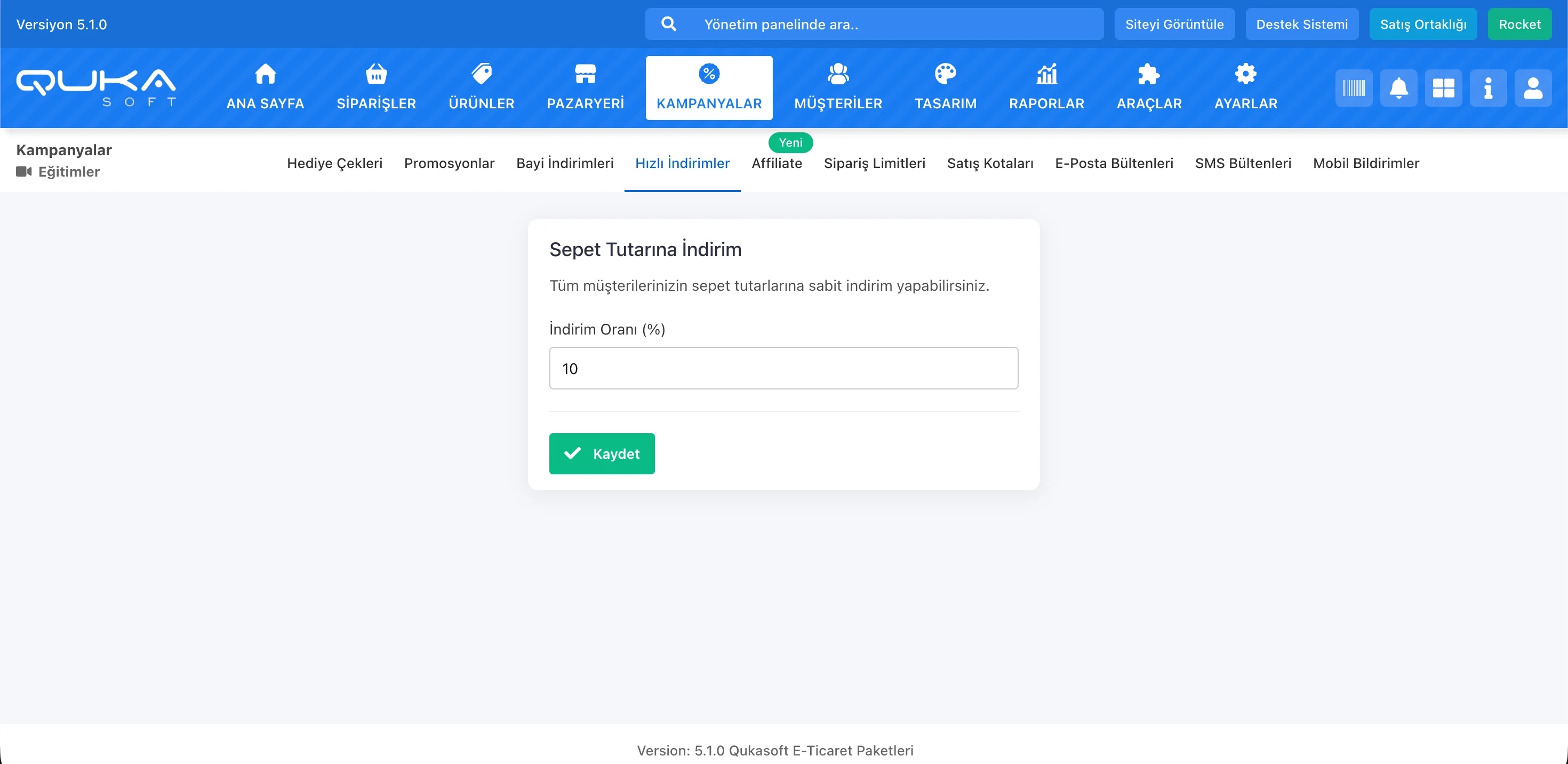 Kampanyalar -> Hızlı İndirimler sayfasına tıklayarak ulaşabileceğiniz bu özellik ile tüm müşterilerinizin sepet tutarlarına % indirim uygulayabilirsiniz.
