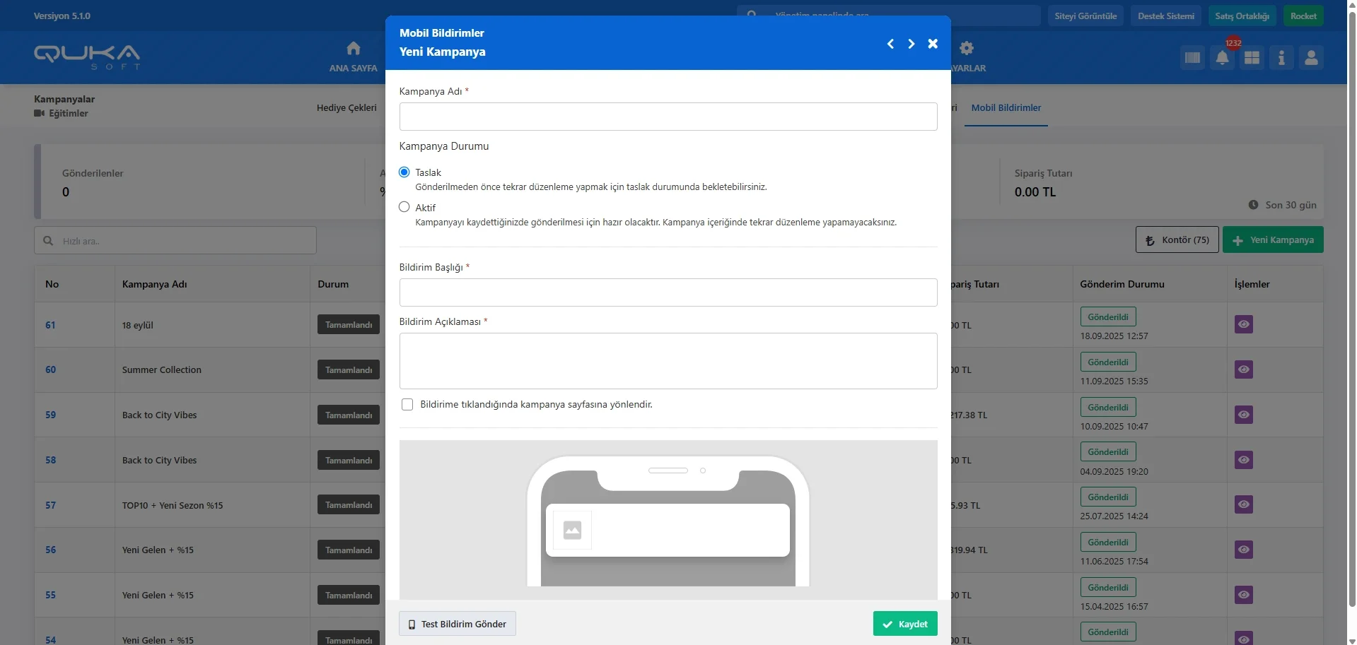 Kampanyalar -> Mobil Bildirimler alanından, mobil cihazlara (akıllı telefon ve tablet) kısa ve anlık mesajlar göndererek kullanıcı etkileşimini artırabilirsiniz.