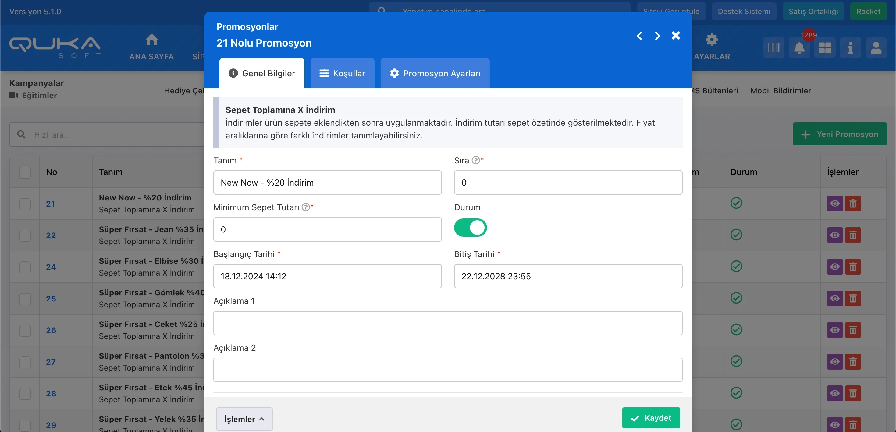 | Açıklama 1 / Açıklama 2 | Promosyona ait ilgili açıklamalar. |