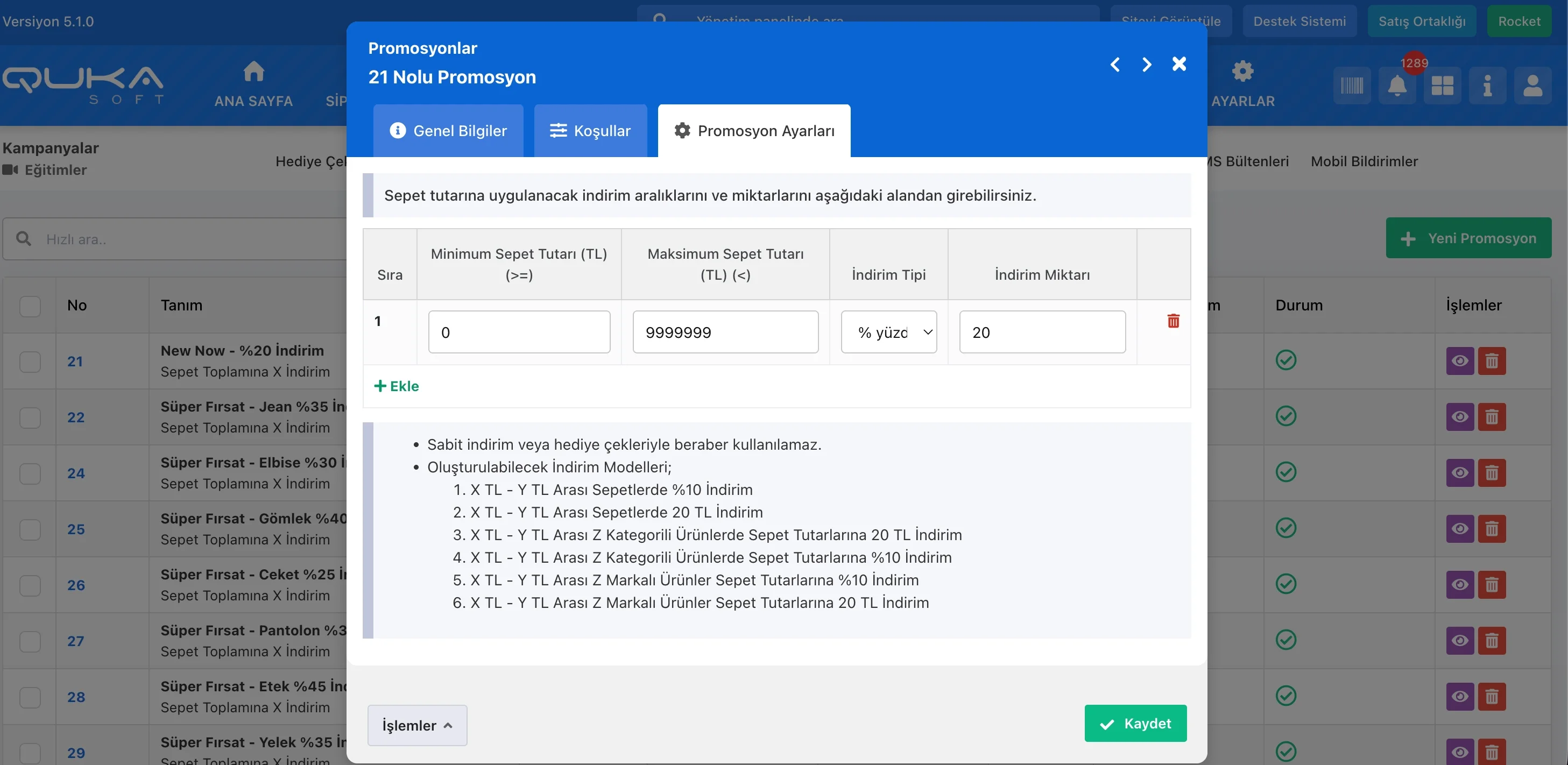 | Minimum Sepet Tutarı (TL) (>=) | İndirimin uygulanması için gereken minimum sepet fiyatı. |