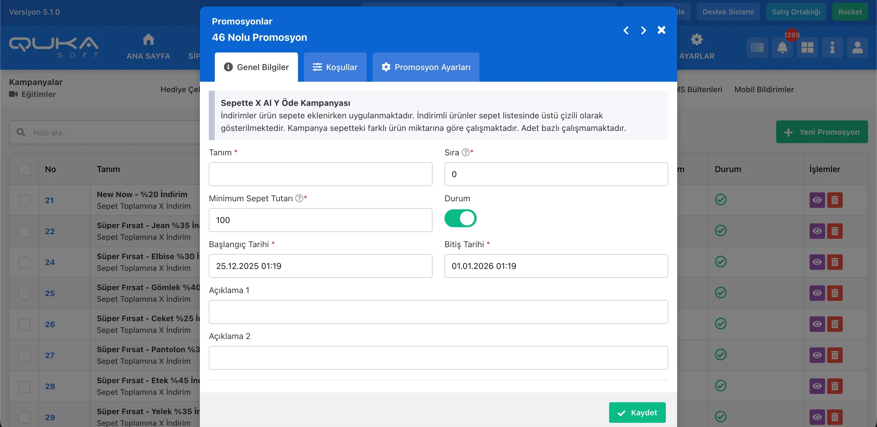 | Açıklama 1 / Açıklama 2 | Promosyona ait açıklamaları girebilirsiniz. |
