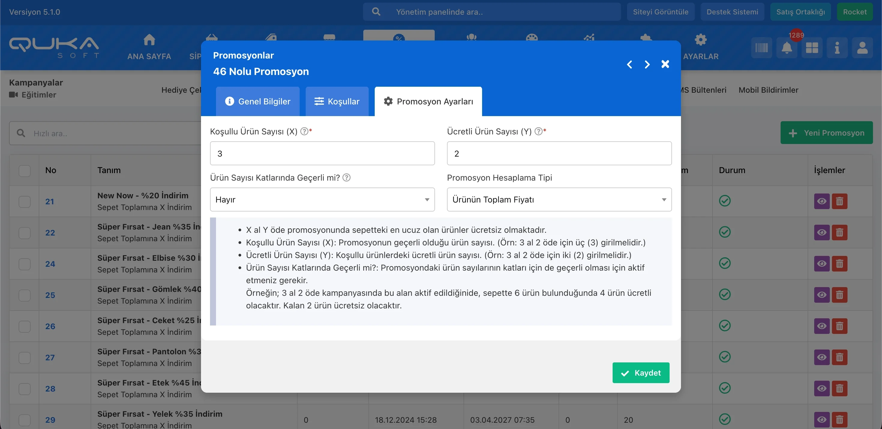 - Ürün Sayısı Katlarında Geçerli mi?: Aktif edilirse, promosyondaki ürün miktarının katları için de geçerli olur (Örn: 3 al 2 öde kampanyası sepette 6 ürün için 4 ürün ücretli, 2 ürün ücretsiz olur).