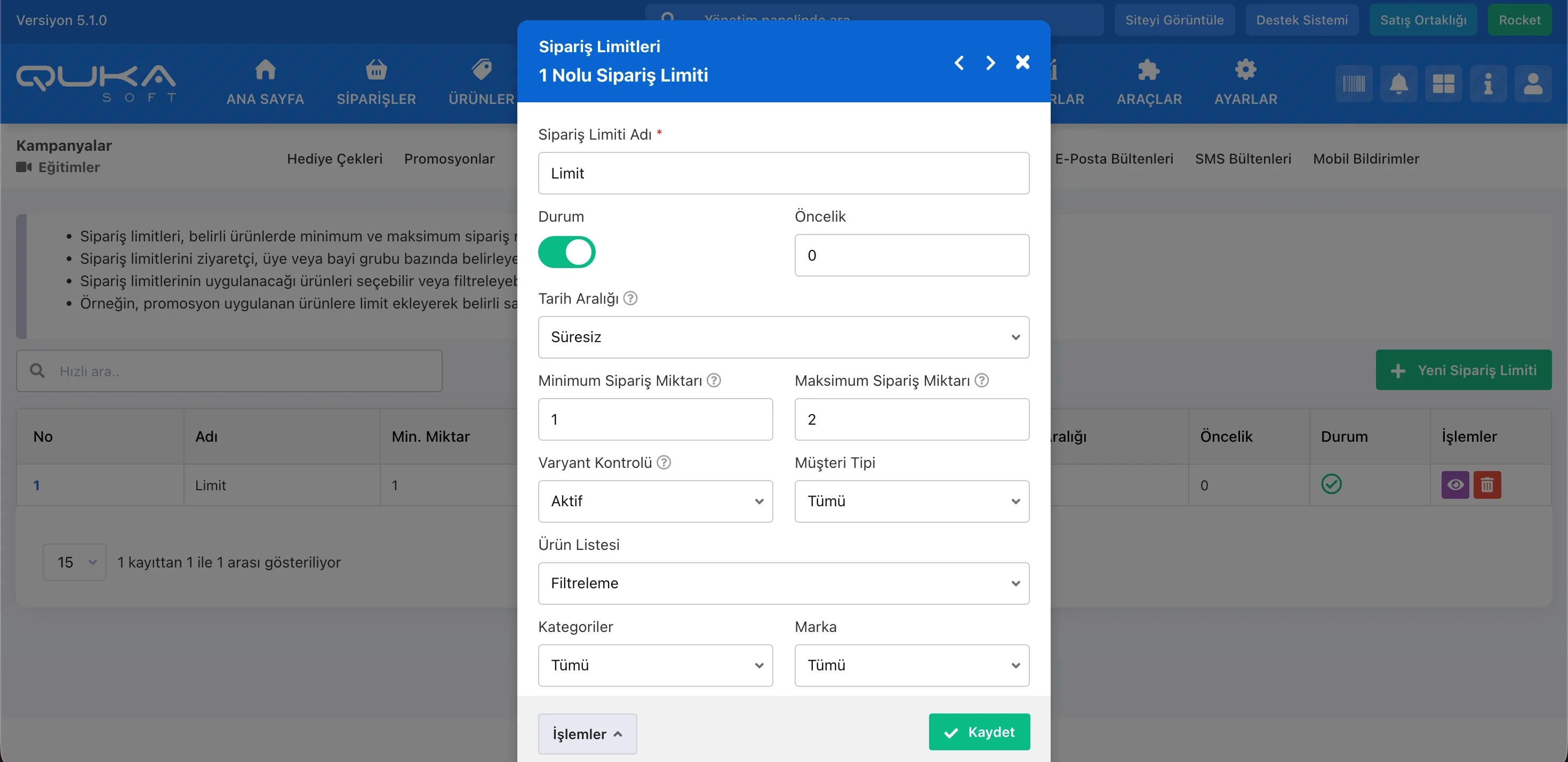 Kampanyalar -> Sipariş Limitleri sayfasından belirli ürünlerde minimum ve maksimum sipariş miktarlarını belirleyebilirsiniz. Bu limitler ziyaretçi, üye veya müşteri grubu bazında ayarlanabilir.