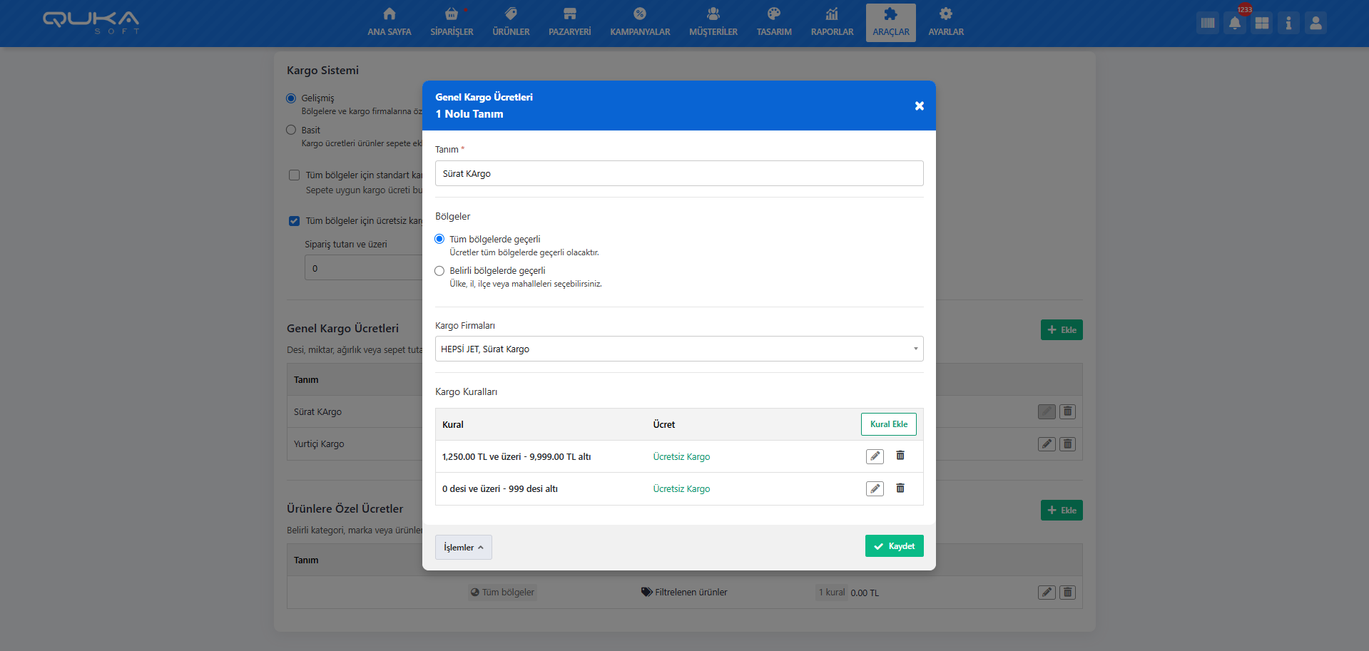 Genel kargo ücretleri; desi, ağırlık, ürün miktarı veya sepet tutarı gibi kriterlere göre maliyetlerin otomatik hesaplanmasını sağlar. Qukasoft yönetim paneli üzerinden bölgesel veya kargo firması bazlı yapılandırmalar gerçekleştirilebilir.