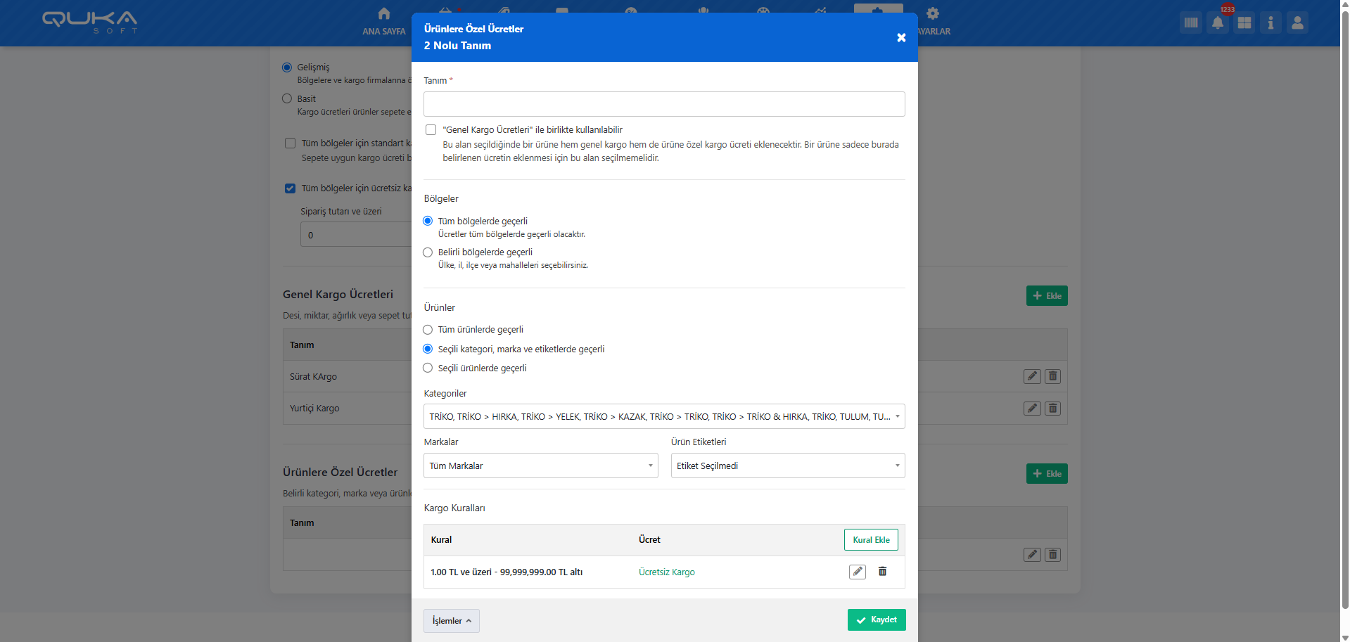 Ürünlere özel kargo ücretleri; desi, ağırlık, ürün miktarı veya sepet tutarı gibi kriterlere göre maliyetlerin otomatik hesaplanmasını sağlar. Qukasoft yönetim paneli üzerinden kargo firması bazlı hesaplamalar yapılandırılabilir.