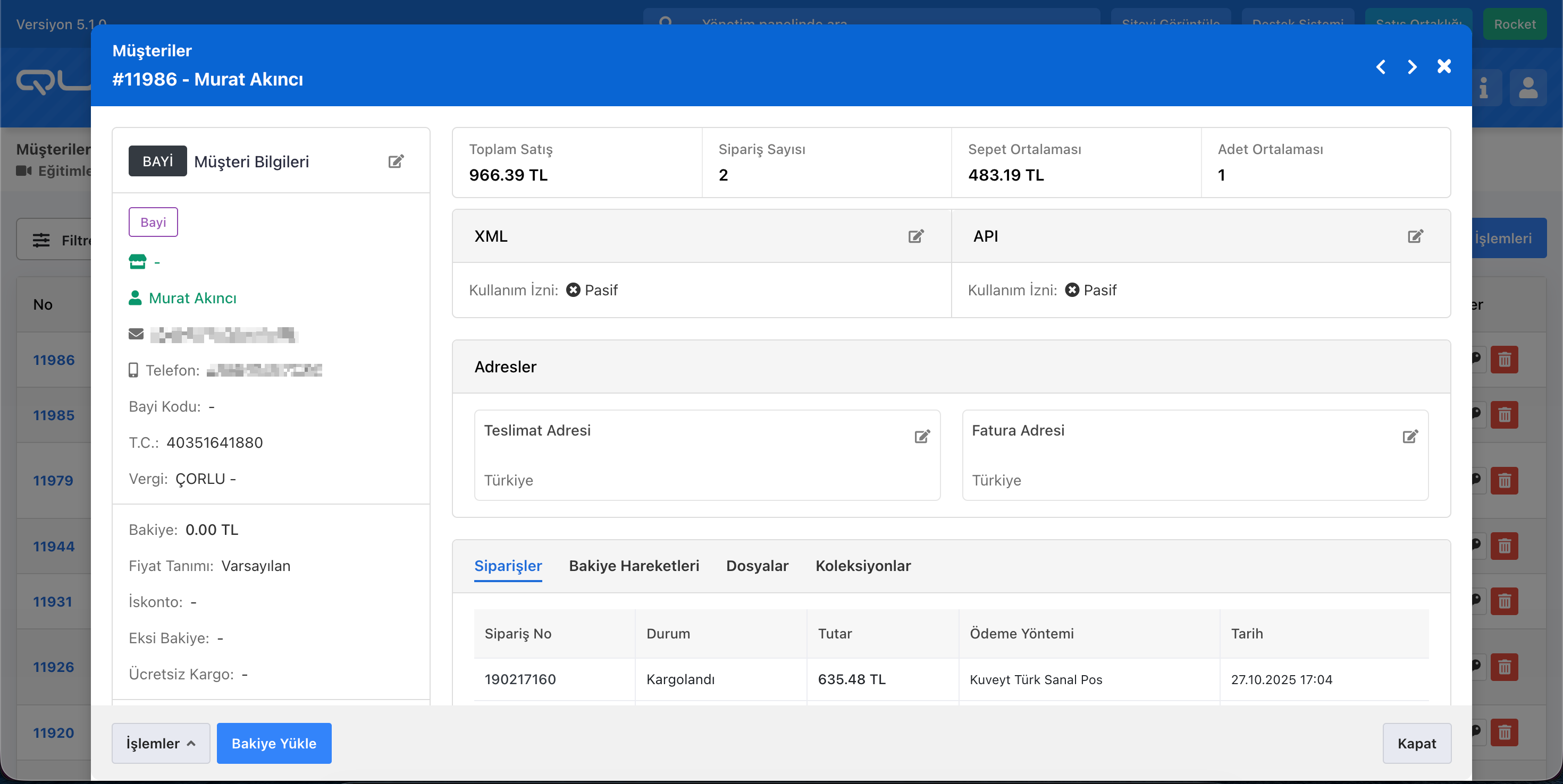 Bu alanda sipariş detayları görüntülenebilir, KDV oranı düzenlenebilir, not eklenebilir ve sipariş durumu (iptal/teslim edildi) güncellenebilir. Ayrıca fatura, e-fatura, kargo fişi ve PDF çıktıları oluşturulabilir.