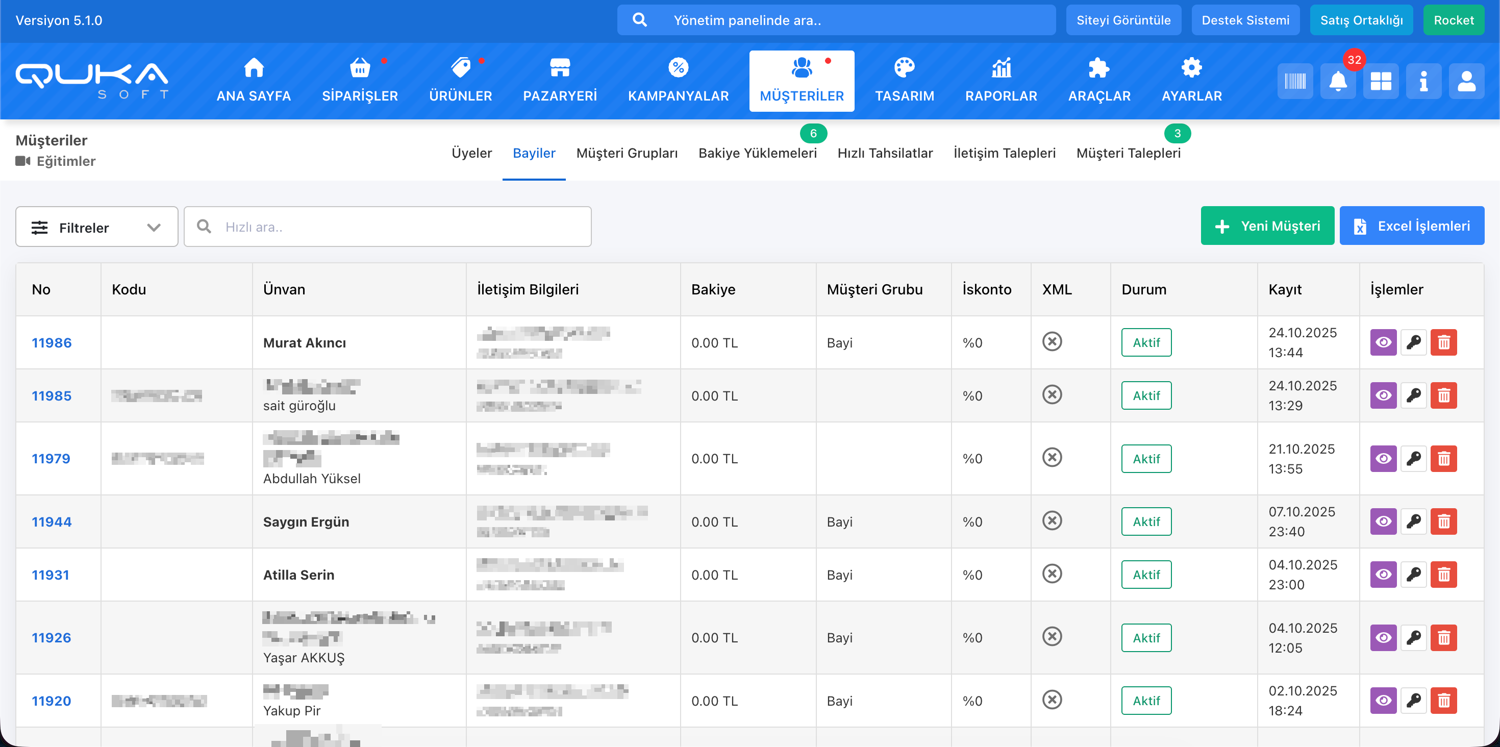 Qukasoft yönetim paneli üzerinde Müşteriler > Bayiler sayfasına girerek sisteme kayıtlı tüm bayileri görüntüleyebilirsiniz.