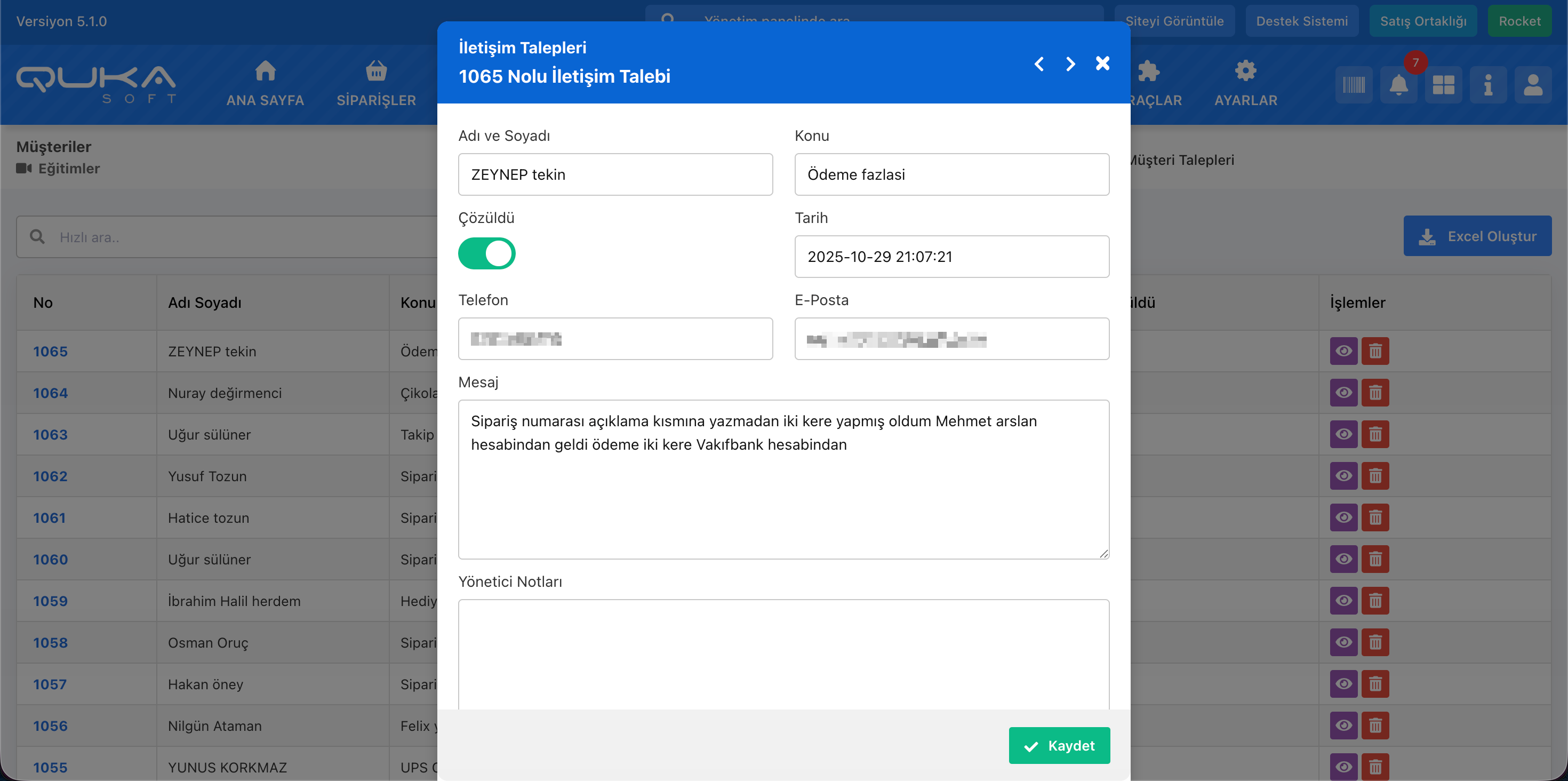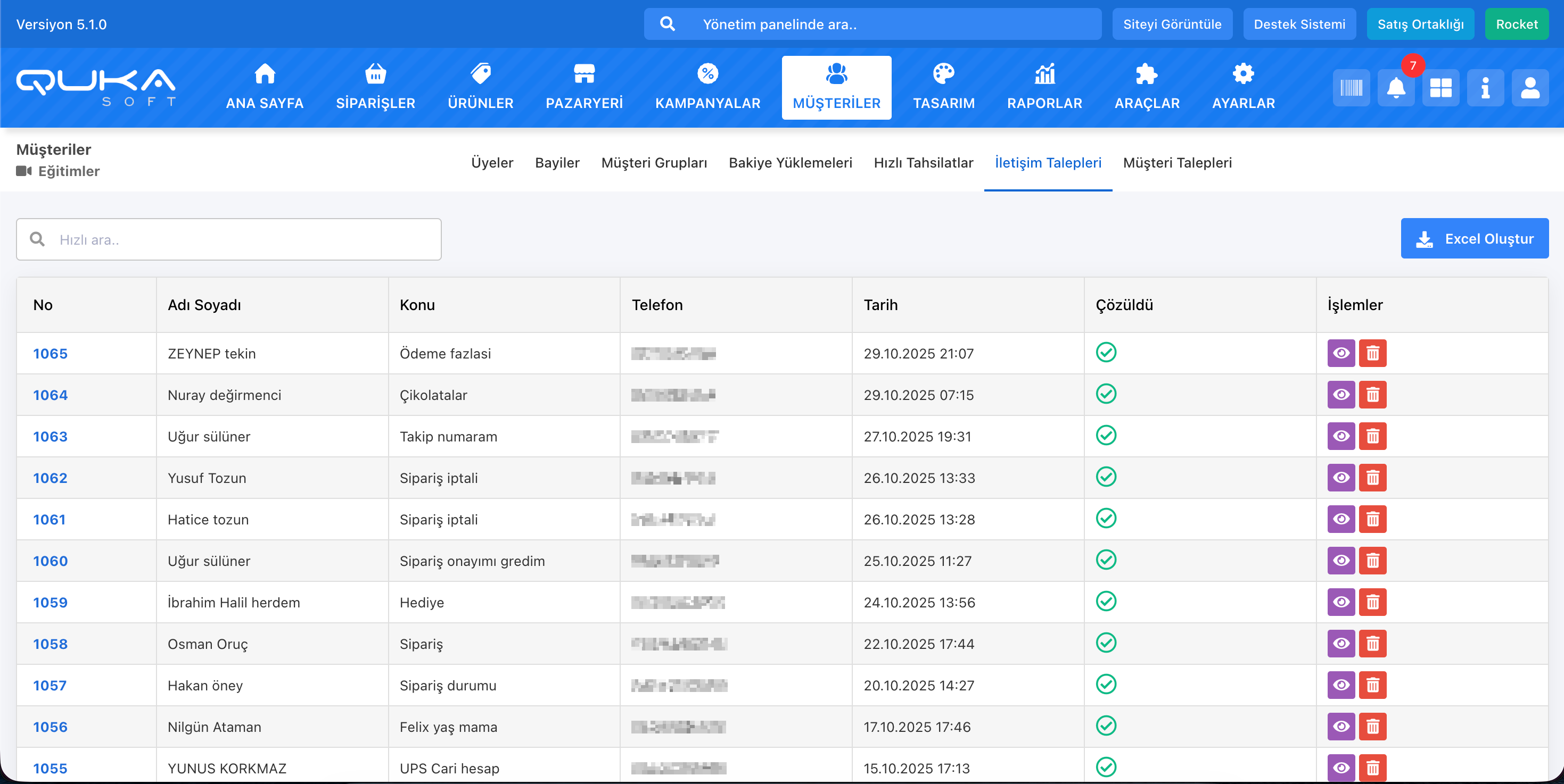 Yönetim panelinde Müşteriler > İletişim Talepleri sayfası üzerinden müşterilerden gelen tüm iletişim talepleri listelenir.