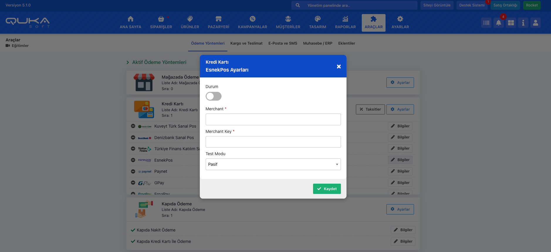 - Araçlar > Ödeme Yöntemleri sayfasına giderek Kredi Kartı ödeme yöntemini aktif hale getirin.