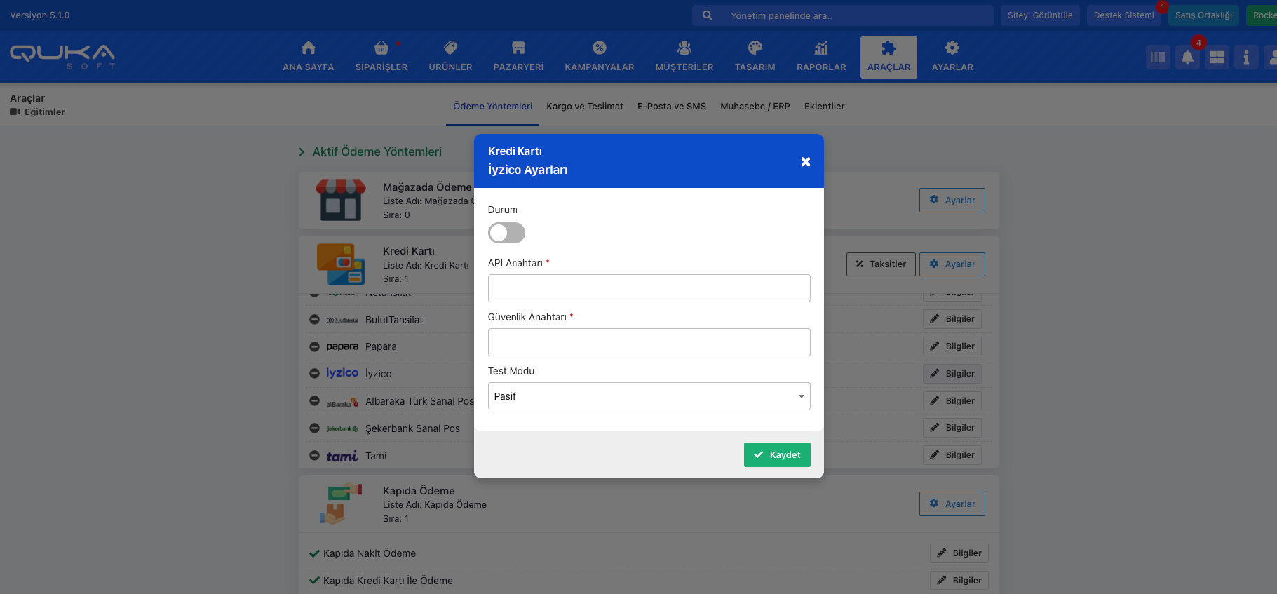 - Araçlar > Ödeme Yöntemleri sayfasından Kredi Kartı seçeneğini aktif edin.