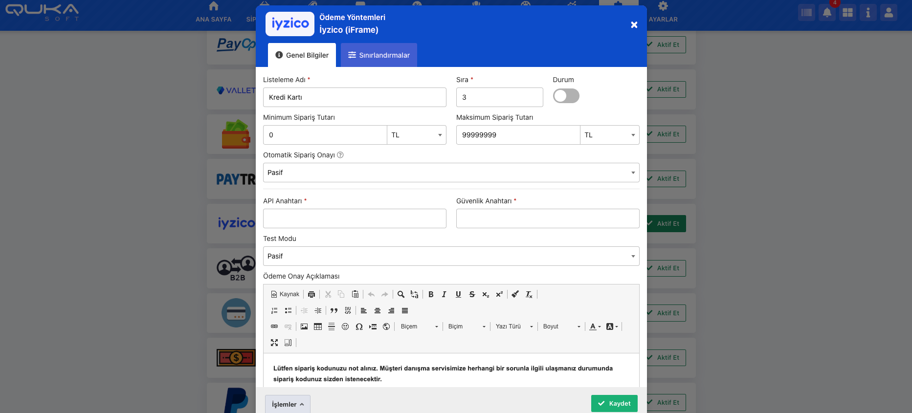 - Iyzico Bilgileri butonuna tıklayarak kopyaladığınız API ve Güvenlik anahtarlarını girin ve durumu aktif edin.
