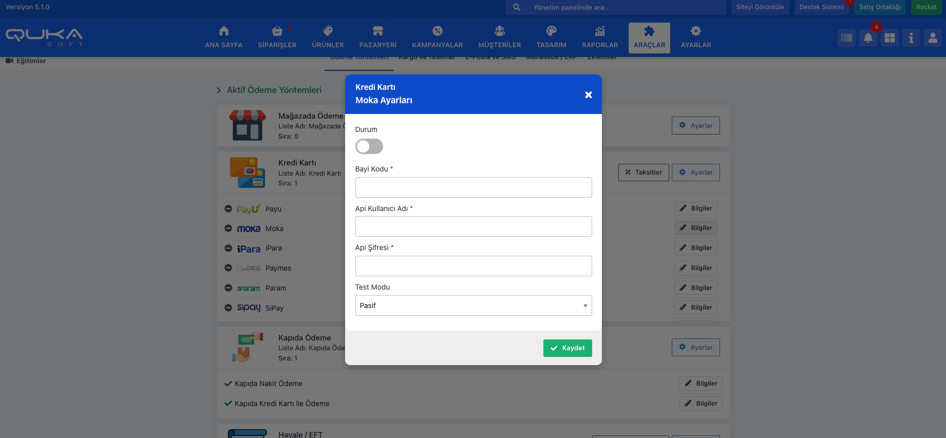 - Moka Bilgileri butonuna tıklayarak Bayi Kodu, API Kullanıcı Adı ve API Kullanıcı Şifresi alanlarını doldurup işlemi kaydedin.
