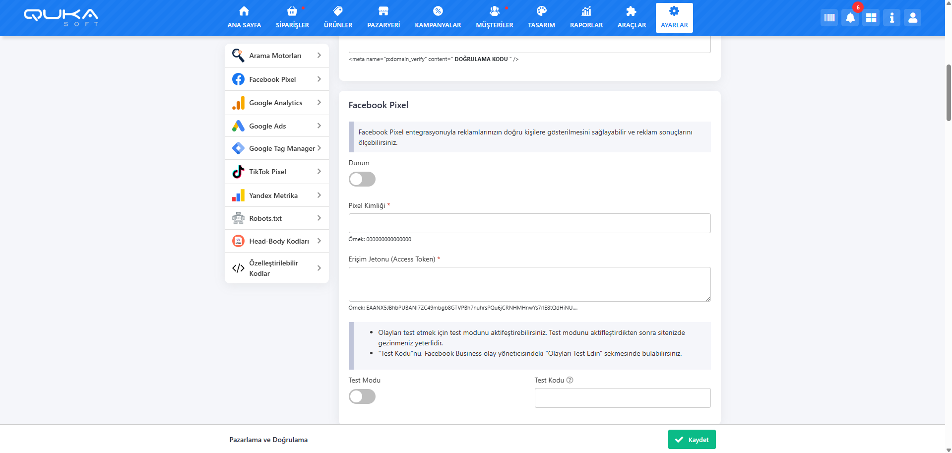 Ayarlar sayfasında Pazarlama ve Doğrulama → Facebook Pixel alanından erişilebilir.