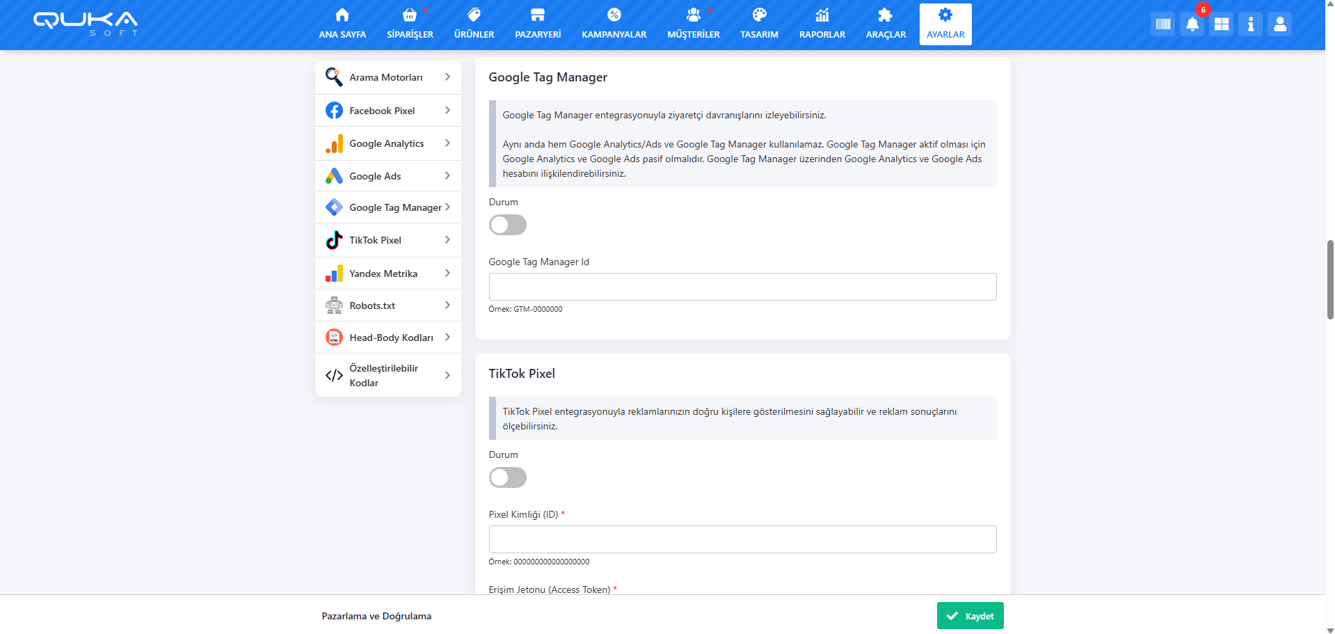 Ayarlar → Pazarlama ve Doğrulama → Google Tag Manager alanına gidin.