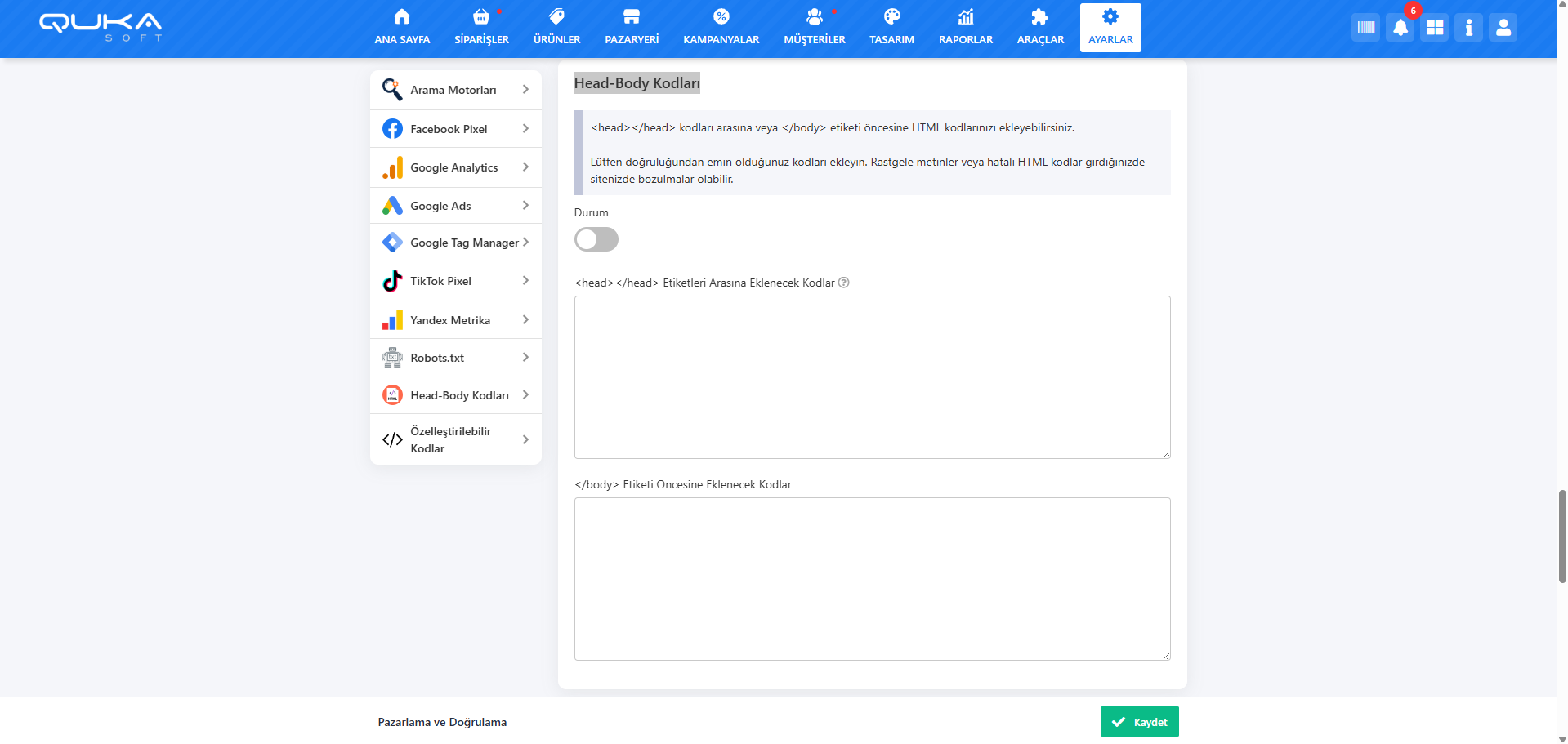 Etiketi Öncesine Eklenecek Kodlar Sayfa yüklendikten sonra çalışması gereken JavaScript kodları, analiz scriptleri veya canlı destek widget’ları bu alana eklenir.