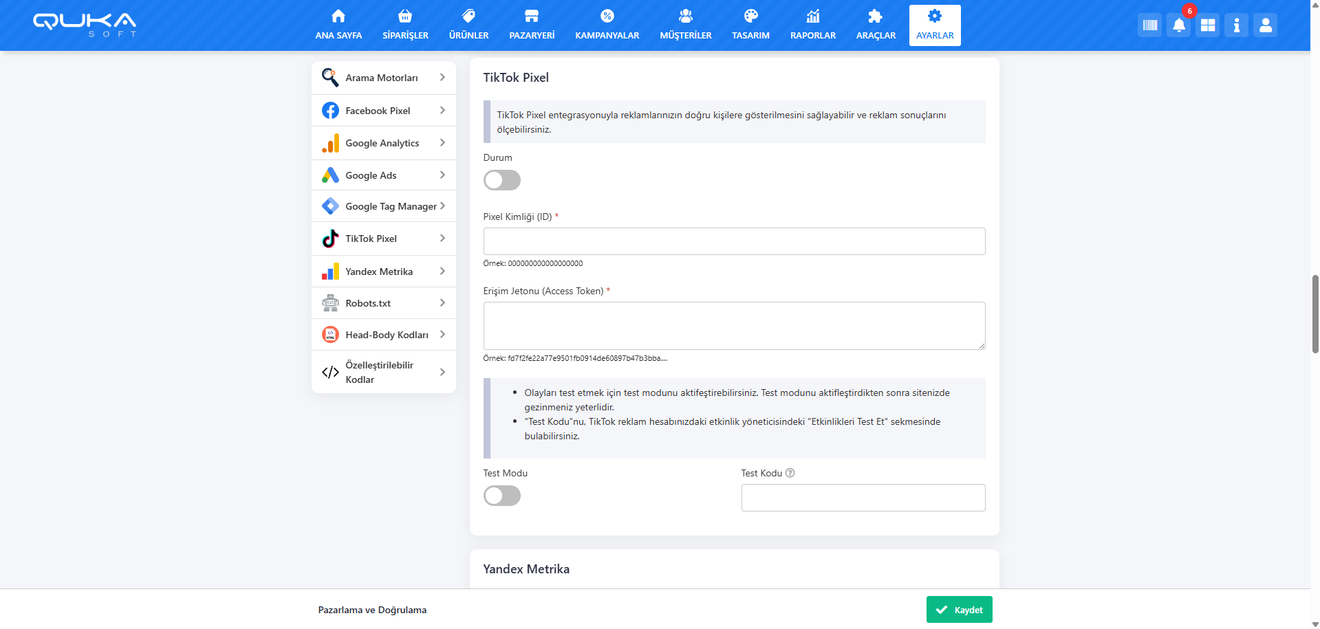 Erişim Jetonu (Access Token) alanına TikTok Pixel’den aldığınız erişim jetonunu girin.