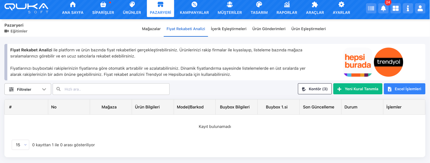 Qukasoft yönetim panelinde Pazaryeri -> Fiyat Rekabet Analizi sayfası üzerinden işlem yapılır.