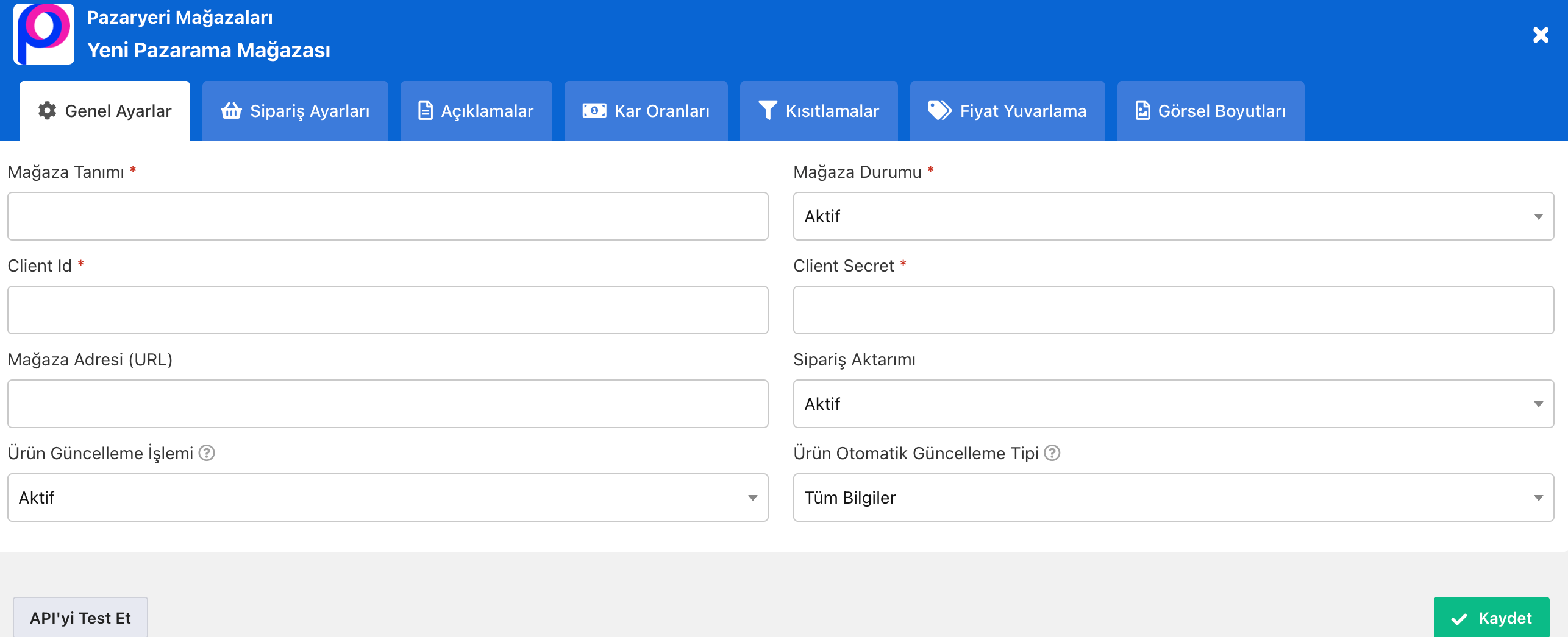 Entegrasyon kurulumunu başlatmak için Pazaryeri -> Mağazalar -> Pazarama Mağazalarım -> Mağaza Ekle adımlarını izleyin.