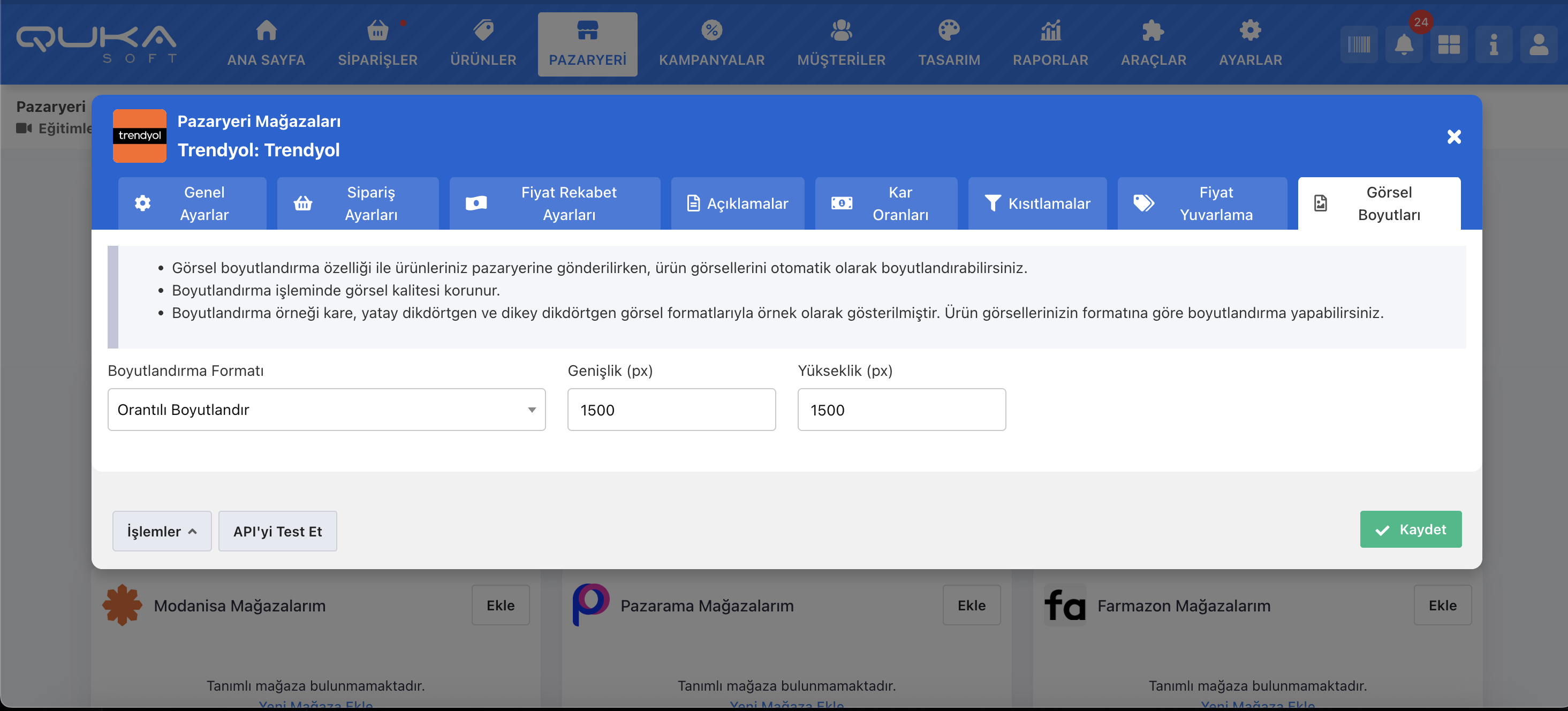 Görsel boyutlandırma özelliği, ürün görsellerinizin pazaryerlerine gönderilmeden önce otomatik olarak boyutlandırılmasını sağlar. Bu işlem sırasında görsel kalitesi korunur.
