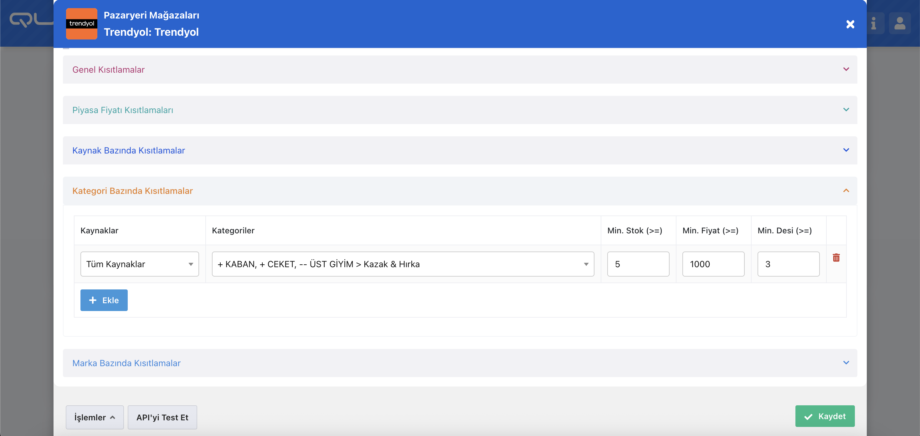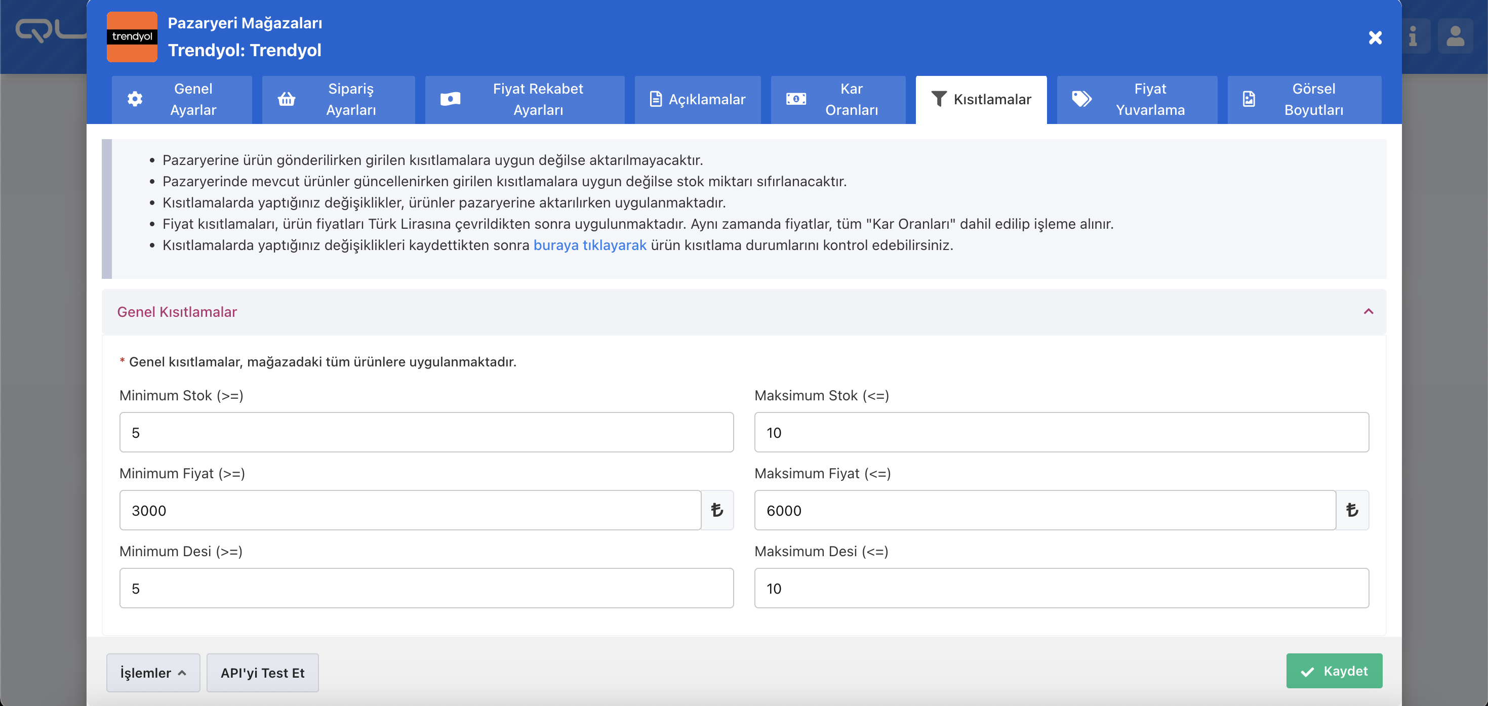 Kısıtlamalar, ürünlerin pazaryerlerine aktarılması sırasında uygulanacak filtreleri ve şartları belirler. Kısıtlama kurallarına uymayan ürünler pazaryerine aktarılmaz veya stok miktarı otomatik olarak sıfırlanır. Pazaryeri -> Mağazalar-> İlgili Mağazaya giriş yaptıktan sonra Kısıtlamalar sekmesi üzerinden giriş yapılır.