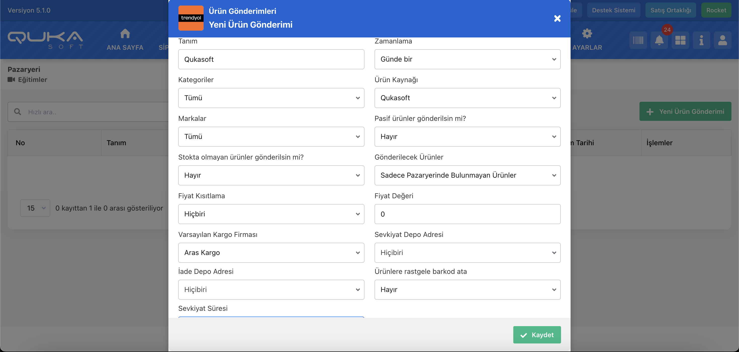 Qukasoft yönetim panelinde Pazaryeri -> Ürün Gönderimleri sayfasına giriş yaparak Yeni Ürün Gönderim butonuna tıklayın. Pazaryeri mağazasını seçtikten sonra gönderim ayarları ekranı açılır.