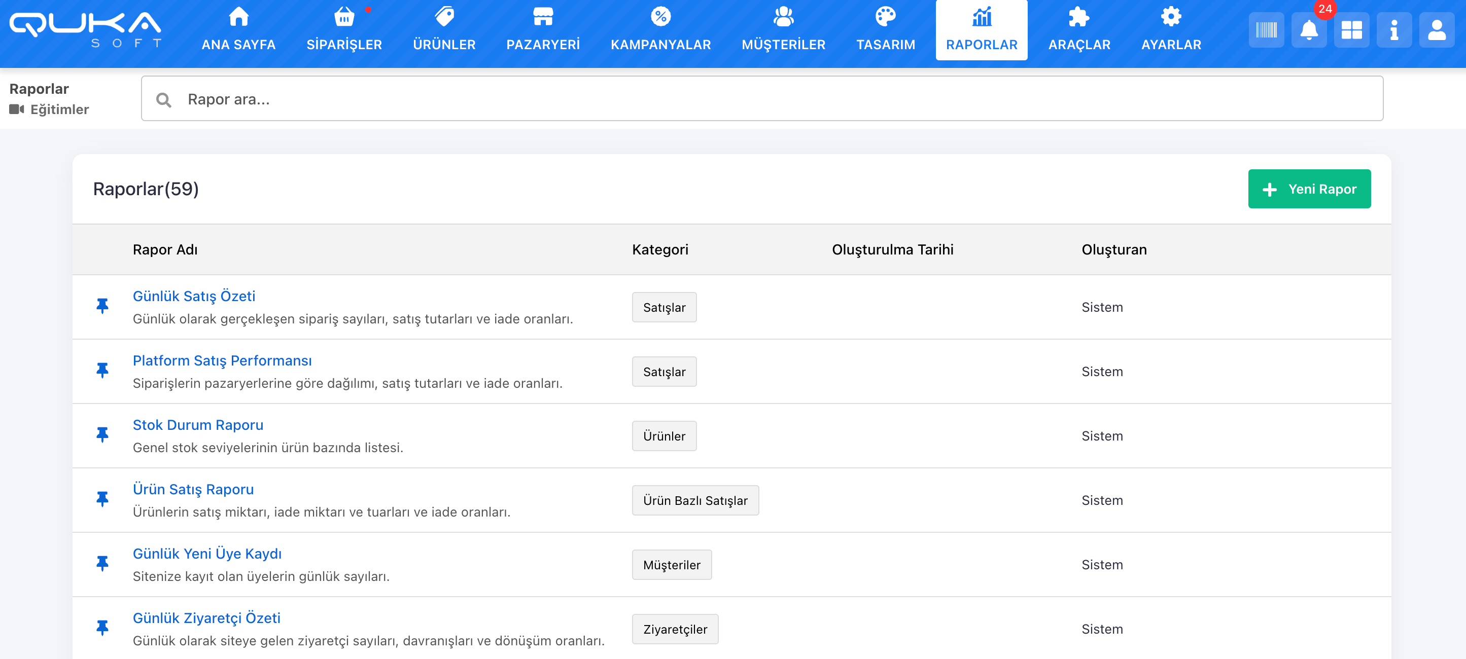 Qukasoft yönetim paneli üzerinde varsayılan olarak sunulan raporlar kategorize edilerek listelenir. Bu listeyi kullanarak satış performansınızı, stok durumunuzu ve müşteri davranışlarını anlık olarak takip edebilirsiniz.