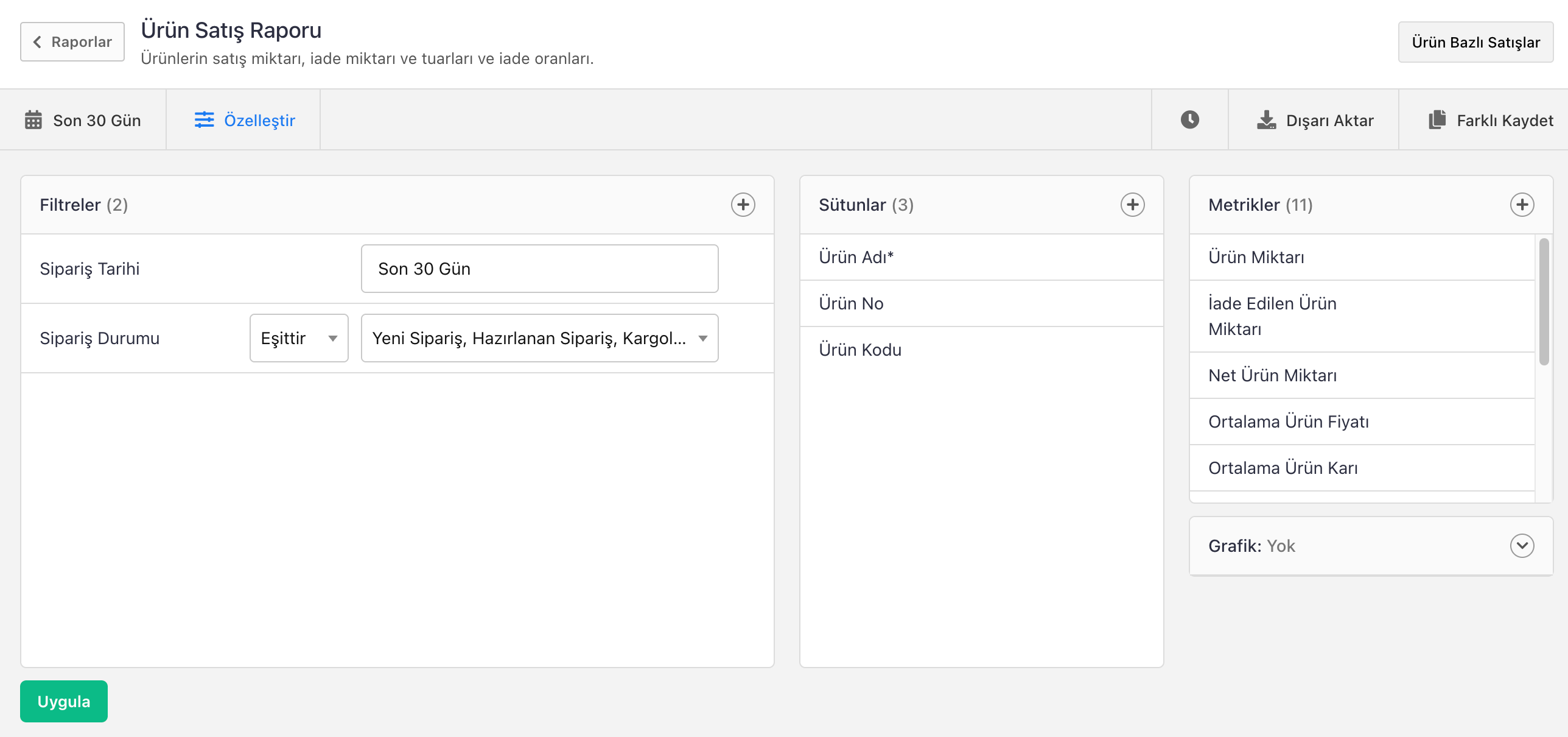 Sütunlar: Tablo yapısındaki kolonları belirler. Ürün kategorisi, hiyerarşisi, KDV hariç fiyatlar veya ürün barkodu gibi teknik detaylar tabloya eklenebilir.