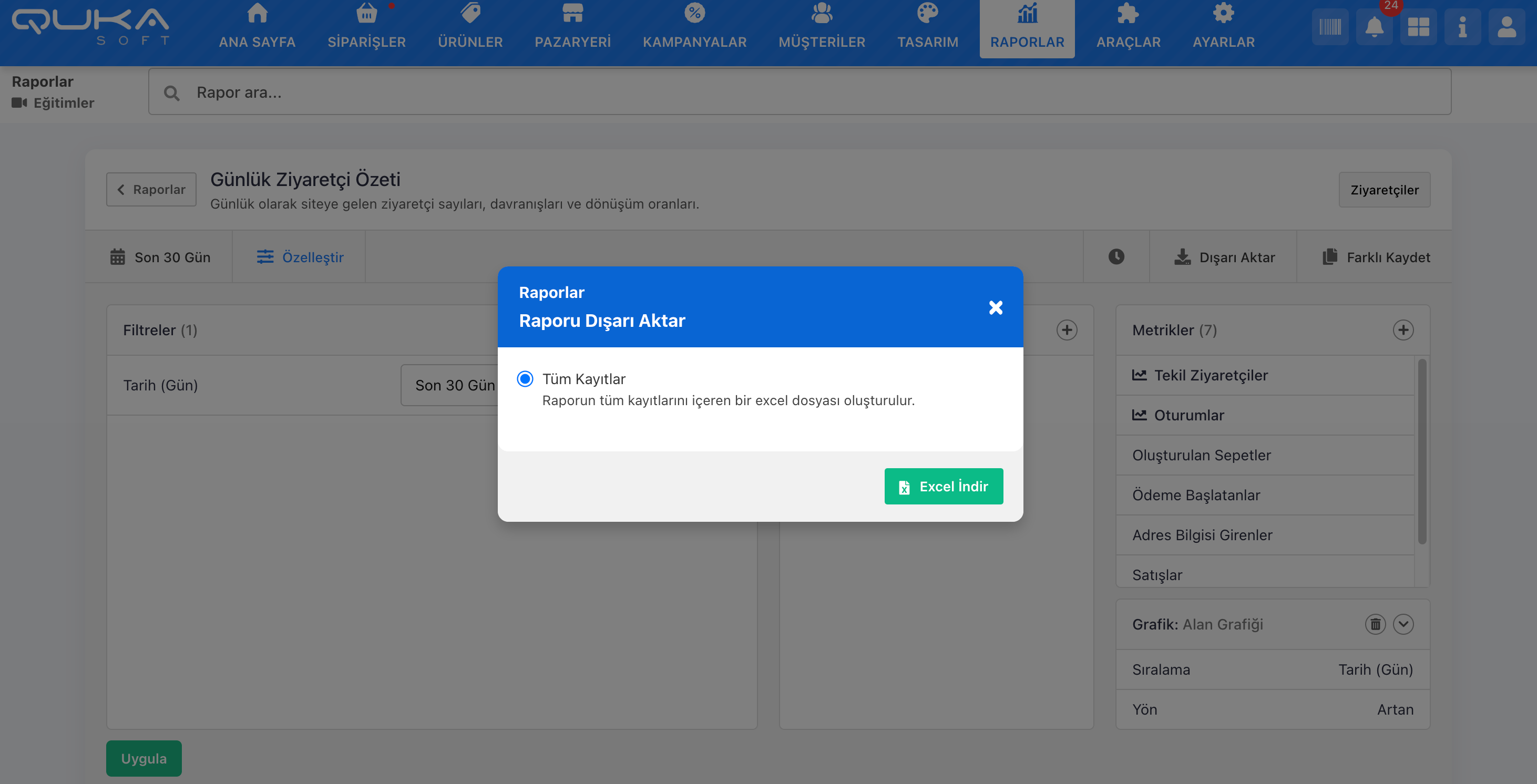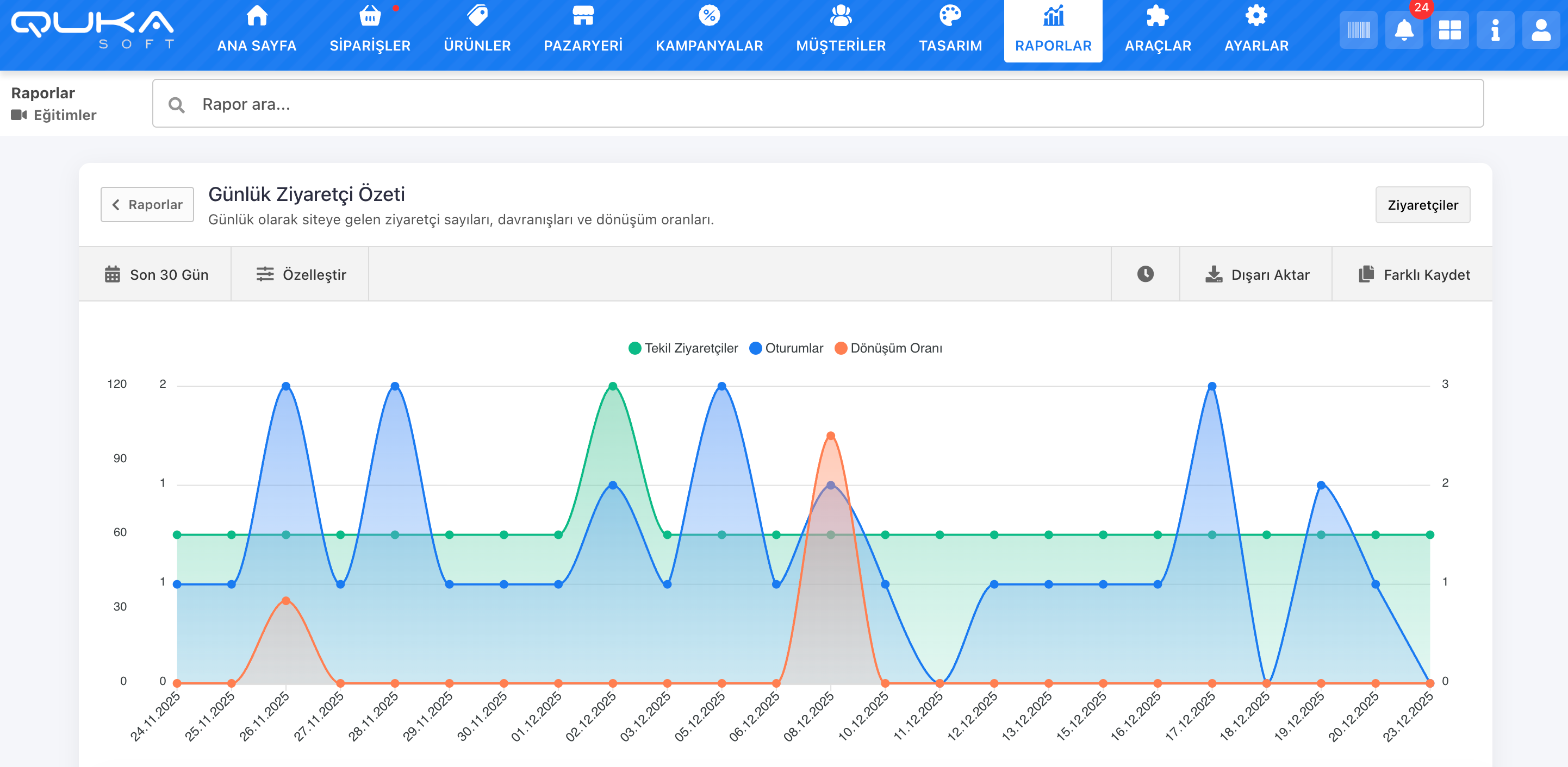 Qukasoft yönetim paneli içerisindeki Raporlar sekmesi üzerinden web sitenize gelen ziyaretçilerin davranışlarını, trafik kaynaklarını ve dönüşüm oranlarını analiz edebilirsiniz. Rapor ara özelliği ile kayıtlı analizlerinize hızlıca ulaşabilir veya özelleştirilmiş yeni raporlar kurgulayabilirsiniz.