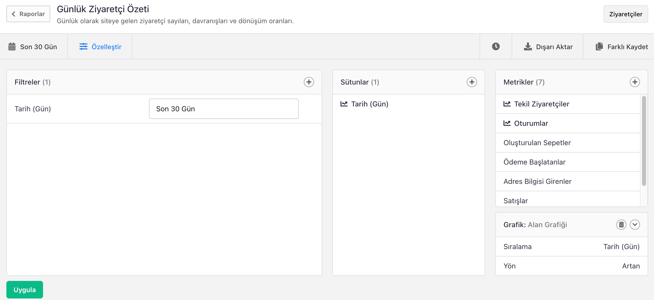 Sütunlar: Tablonun kolon yapısını belirler. Tarih (Gün, Ay-Yıl, Yıl), trafik kanalı ve UTM bilgileri gibi detaylar eklenerek tablo görünümü zenginleştirilebilir.