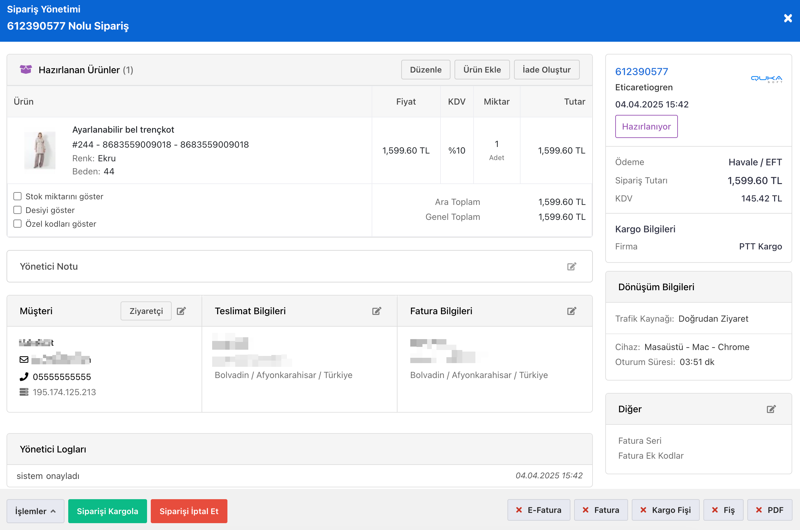 | Durumu Değiştir | Sipariş durumunu manuel olarak günceller. |
