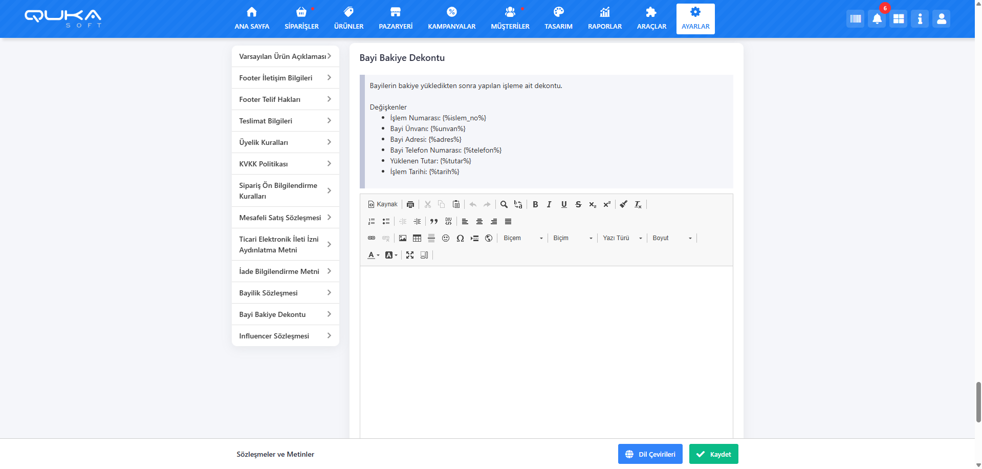 Bayi bakiye dekontu alanına, bakiye yükleme işlemini açıklayan ve finansal bilgileri içeren metin girilir. İçerik, değişkenler kullanılarak her işleme özel olacak şekilde dinamik olarak düzenlenebilir.