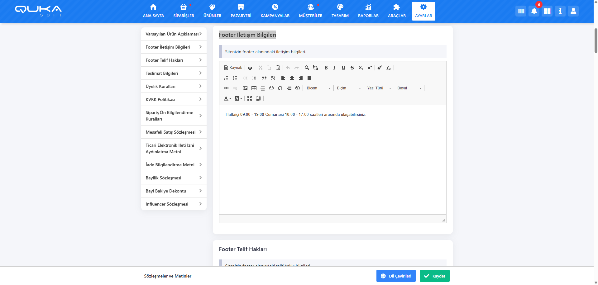 Yönetim panelinde Ayarlar > Sözleşmeler ve Metinler sayfası üzerinden footer iletişim bilgilerine erişilir.