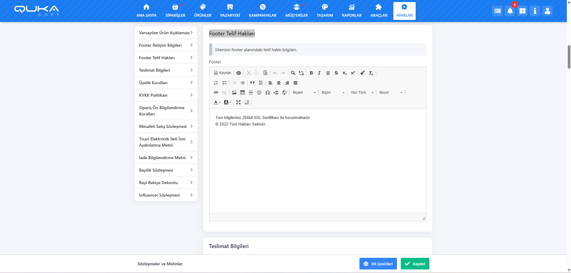 Yönetim panelinde Ayarlar > Sözleşmeler ve Metinler sayfası üzerinden footer telif hakları metnine erişebilirsiniz.