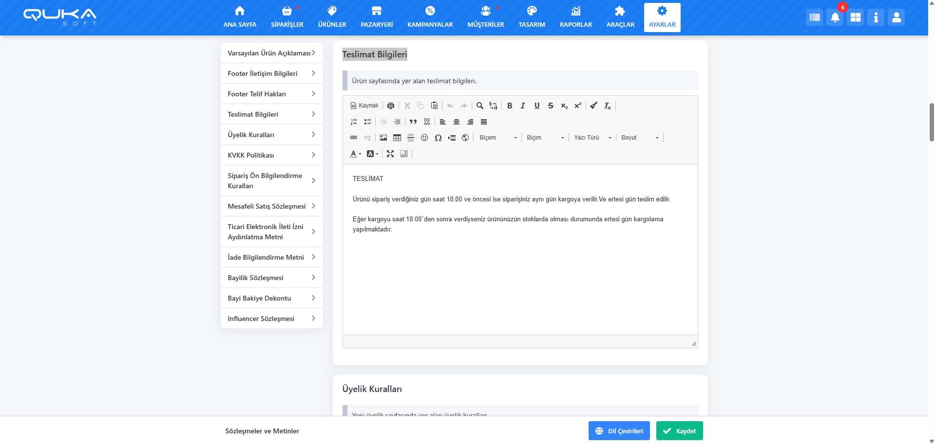 Yönetim panelinde Ayarlar > Sözleşmeler ve Metinler sayfası üzerinden teslimat bilgilerine erişebilirsiniz.