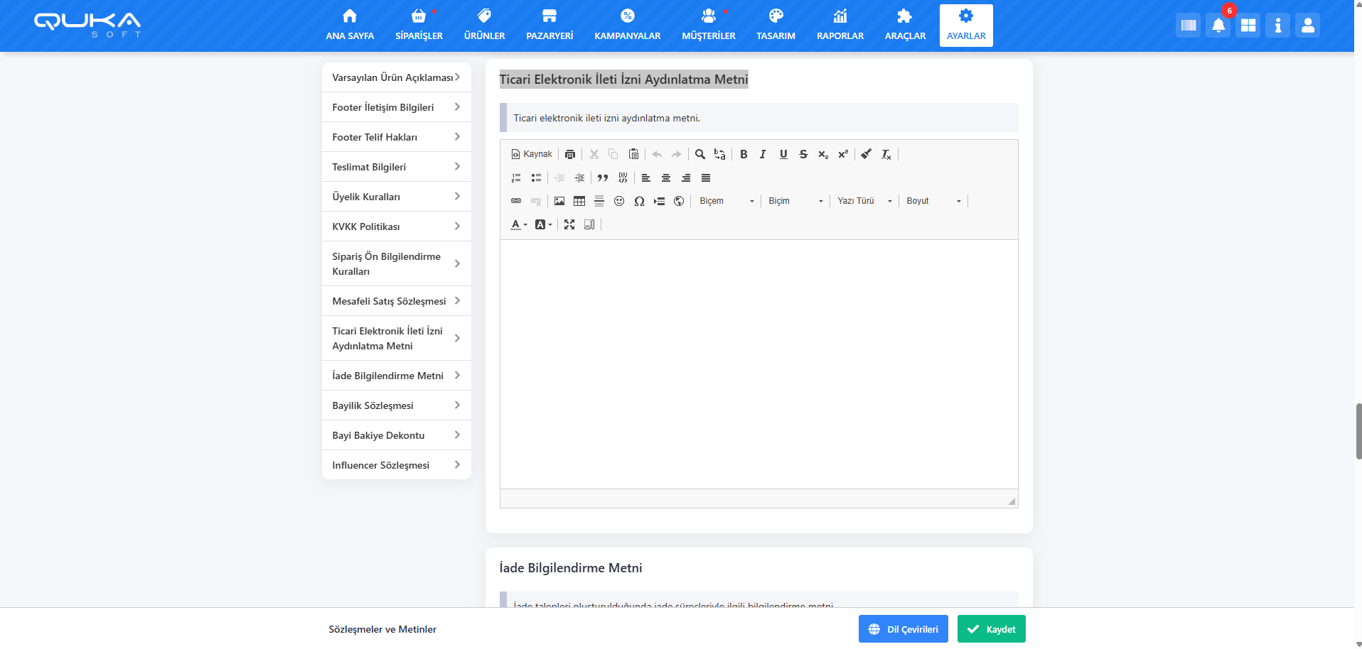 Metne Ayarlar > Sözleşmeler ve Metinler alanından erişilir. Tanımlanan içerik; ödeme sayfası, üyelik sayfası ve e-bülten alanlarında otomatik olarak görüntülenir.