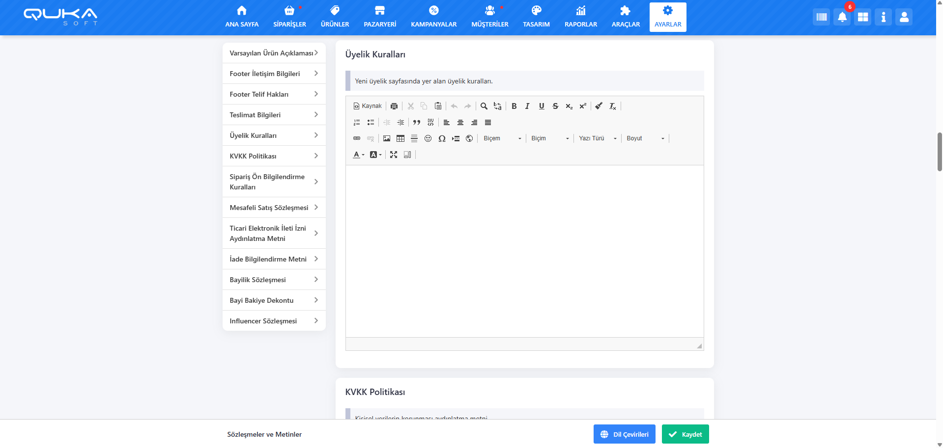 Yönetim panelinde Ayarlar > Sözleşmeler ve Metinler sayfası üzerinden üyelik kurallarına erişebilirsiniz.